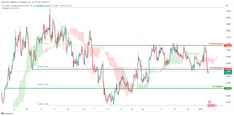 USD/CAD: возможен нисходящий тренд - технический анализ на 05.01.2023ИнстаФорекс - Instaforex, 2 года назад На 4-часовом графике валютной пары USD/CAD преобладает медвежий настрой. Цена опустилась ниже облака Ишимоку, что указывает на медвежий рынок. Если падение пары продолжится, цена может направиться в сторону первой линии поддержки на отметке 1,33578, где также расположен уровень Фибоначчи 20%. При другом сценарии цена может снова двинуться вверх в попытке пробить первую линию сопротивления на отметке 1,35029, которая совпадает с уровнем Фибоначчи 38.2%. Затем возможно движение по направлению ко второй линии сопротивления 1,36865, совпадающей с уровнем Фибоначчи 61.8%. Торговые рекомендации: Точка входа: 1,35029 Условия для входа: первая линия сопротивления Тейк-профит: 1,33578 Условия для фиксирования прибыли: первая линия поддержки Стоп-лосс: 1,36865 Условия для выставления стоп-лосса: вторая линия сопротивления Материал предоставлен компанией InstaForex - www.instaforex.com |