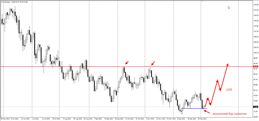 Присмотритесь к покупке нефти. Торговая идея по WTIИнстаФорекс - Instaforex, 2 года назад Добрый день, уважаемые трейдеры! Представляю вашему вниманию торговую идею по нефти WTI Итак, начало торгового года ознаменовалось новым отвесным понижением котировок до минимальных значений прошлого года. Вчера вышли данные по запасам сырой нефти в США, и они были немалые: На этом фоне торговый день не закрылся понижением, а внутренним баром, который ложно пробил важный для покупателей уровень 73$ На этом фоне предлагаем рассмотреть вариант набора лонговых позиций начиная с текущих цен и выше по следующей схеме: По первой позиции риски ограничить 72,4$, прибыль зафиксировать за 83 и 93$. Торговая идея представлена в рамках метода "Price Action" и "Охота за стопами". |