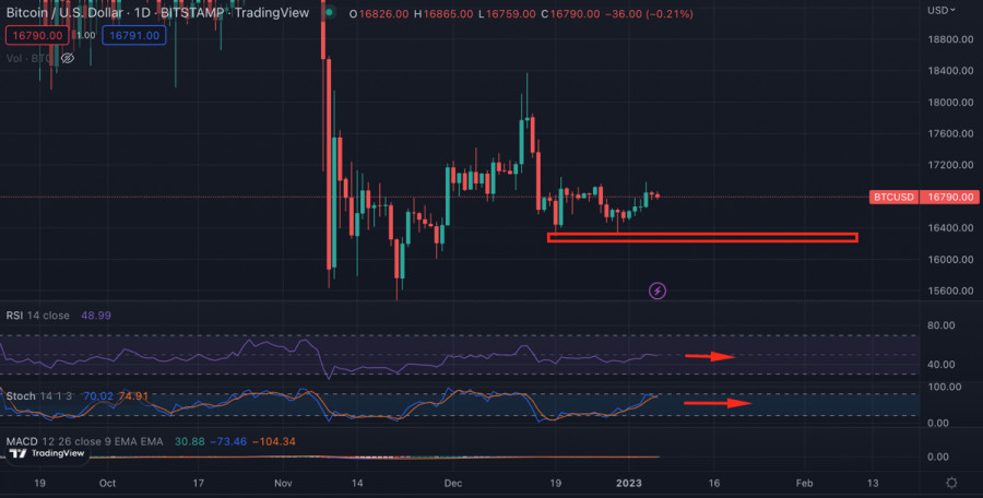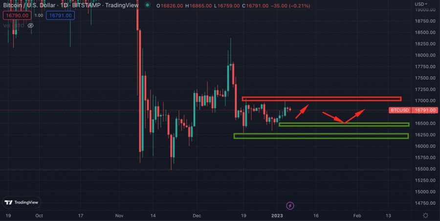 Биткоин продолжает консолидационное движение в преддверии макростатистики США: стоит ли ждать повышение волатильности?ИнстаФорекс - Instaforex, 2 года назад Биткоин продолжает флетовое движение после реализации локального бычьего импульса. По итогам краткосрочного всплеска торговой активности, котировки BTC/USD достигли уровня $16,8k. По состоянию на 6 января криптовалюта продолжает консолидироваться вблизи данной отметки. По итогам 5-го января цена не совершила существенных ценовых движений и осталась вблизи уровня $16,8k. Таким образом покупателям не удалось реализовать бычий импульс, который прослеживался на дневном графике Биткоина. В преддверии выходных криптовалюта также имеет низкие шансы выйти за пределы диапазона $16,4k-$16,9k. Объемы торгов и число уникальных адресов в сети BTC остаются вблизи локального минимума. На выходных торговая активность упадет еще ниже, а потому ожидать существенных ценовых движений не стоит. Негативные факторыПри этом за последние два дня появилось несколько громких заголовков, которые способны ухудшить положение рынка криптовалют в среднесрочной перспективе. Представители ФРС дали комментарий о дальнейшей политике ведомства и судьбе ключевой ставки. Чиновник регулятора Кашкари заявил, что сделать паузу в повышении ключевой ставки стоит, когда показатель достигнет уровня 5,4%. При этом член ФРС отметил, что в 2023 году не планируется смягчение монетарной политики и снижение ключевой ставки. О трудном 2023 для крипто стартапов заявили аналитики Galaxy Research. По мнению главы отдела исследований Алекса Торна объемы инвестиций венчурных фирм в web3 и блокчейн проекты в 2023 году значительно сократятся. Торн считает, что нисходящая тенденция продлится до конца 2023 года, когда макроэкономическая ситуация начнет улучшаться. Тем временем макроданные в США предвещают сложный год для мировой экономики. Показатель рынка труда Nonfarm Employment составил 235 тыс при прогнозе 150 тысяч. Эти данные свидетельствуют о постепенном ухудшении дел в экономике США и росте безработицы. Анализ BTC/USDВ техническом плане котировки Биткоина не представляют особого интереса, так как актив планомерно движется по флету. Однако заявление ФРС и статистика по рынку труда может изменить соотношение сил на фондовом рынке, и соответственно, крипто рынке. Помимо этого сегодня, 6 января, выходит второй пакет данных рынка труда в США. И вне зависимости от показателей, результат будет иметь негативный окрас. Если безработица начнет расти по основным индексам, то это будет означать постепенное вхождение экономики США в фазу рецессии. В случае, если рынок труда продолжит оставаться сильным, то это развяжет руки ФРС для дальнейшего повышения ключевой ставки. В ближайшем будущем, вероятно, именно показатели рынка труда будут влиять на политику ФРС. Для Биткоина и рынка криптовалют эта статистика может стать поводом для активизации торговой активности и существенных ценовых движений. Так как объемы остаются низкими, есть вероятность движения в любом из направлений, а основным катализатором для этого станут действия маркетмейкера. ИтогиКардинальным образом ситуация на рынке криптовалют не меняется, и вряд ли поменяется в ближайшее время. Поэтому остаются в силе прогнозы для лонговых и шортовых идей по Биткоину. Если криптовалюте удастся закрепиться выш