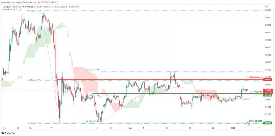 ETH/USD: возможен восходящий тренд - технический анализ на 06.01.2023ИнстаФорекс - Instaforex, 2 года назад На 4-часовом графике пары ETH/USD преобладает бычий настрой, поскольку цена прошла выше облака Ишимоку, что является признаком бычьего рынка. Если бычий импульс продолжится, то цена направится к первому уровню сопротивления 1 308,21, где также находится уровень Фибоначчи 38.2%. При другом развитии событий цена может снова пойти вниз в попытке пробить первый уровень поддержки на отметке 1 231,62, которая совпадает с уровнем Фибоначчи 50%. Торговые рекомендации: Точка входа: 1 308,21 Условия для входа: повторный тест первой линии сопротивления Тейк-профит: 1 231,62 Условия для фиксирования прибыли: первая линия поддержки Стоп-лосс: 1 351,87 Условия для выставления стоп-лосса: последний локальный максимум Материал предоставлен компанией InstaForex - www.instaforex.com |
