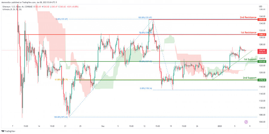 ETH/USD развивает бычий импульс. Прогноз на 9 января 2023 г.ИнстаФорекс - Instaforex, 2 года назад На 4-часовом графике пара ETH/USD торгуется в восходящем тренде. Цена пересекает облако Ишимоку и движется вдоль восходящей линии тренда, что указывает на бычий импульс. Если этот импульс сохранится, ожидается, что пара направится к 1-му уровню сопротивления 1308.21, где расположен уровень коррекции Фибоначчи 78.6%. В альтернативном сценарии цена может развернуться вниз, чтобы повторно протестировать 1-й уровень поддержки 1231.62, соответствующий уровню коррекции Фибоначчи 38.2%. Торговая рекомендация Вход: 1231.62 Условия для входа: повторное тестирование 1-го уровня поддержки Тейк-профит: 1308.21 Условия для фиксации прибыли: 1-й уровень сопротивления Стоп-лосс: 1179.10 Условия для активации ордера стоп-лосс: 2-й уровень поддержки Материал предоставлен компанией InstaForex - www.instaforex.com |