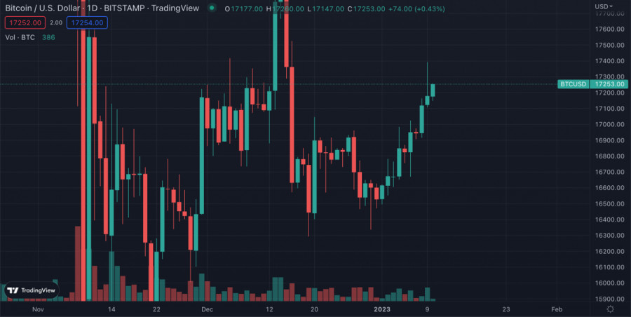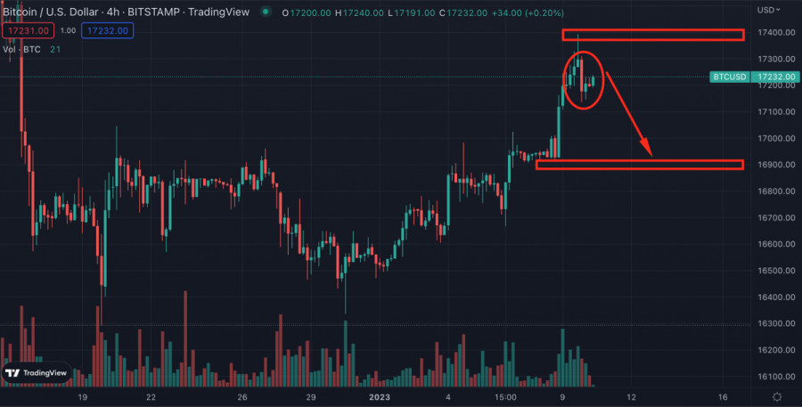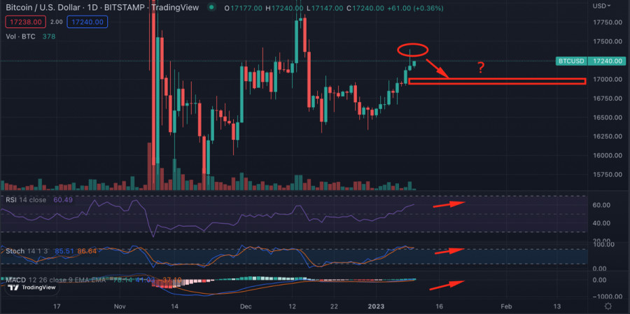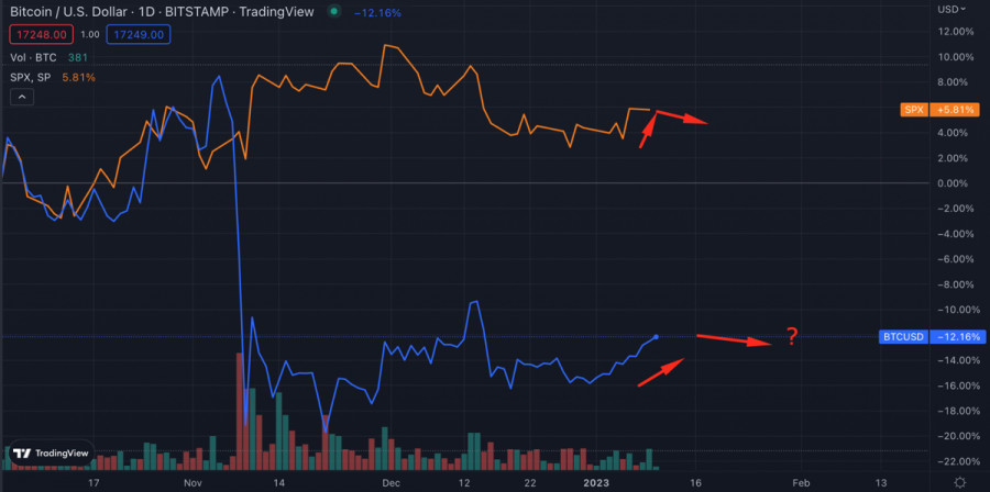 Биткоин приближается к важному уровню сопротивления: стоит ли ожидать локальной коррекции?ИнстаФорекс - Instaforex, 2 года назад Биткоин сохраняет восходящий запал, который криптовалюта получила в начале новой недели. Активу удалось совершить прорыв нескольких ключевых уровней сопротивления, что позволило нарастить бычий потенциал и продолжить движение к локальным максимумам. Среди вероятных причин восходящего движения Биткоина мелькает улучшение макроэкономической ситуации и активизации разных категорий инвесторов. Этот процесс связывают с ситуацией в Китае, где окончательно отменили все ковидные ограничения. Завершение очередного раунда борьбы с коронавирусом в Китае спровоцировал взрывную реакцию азиатских рынков. Аналитики прогнозируют, что в ближайшие недели стоит ожидать роста основных азиатских индексов на 10%-15%, а также укрепление юаня. Активизация азиатских рынков также вызвала ценовой рост на рынке энергоресурсов, а именно нефти. Марки Brent и West Texas выросли в цене на 1,2%, что является прямым следствием более активных действий азиатских инвесторов. Насколько этот процесс окажется позитивным для рынка криптовалют, пока неясно, но мировая экономика однозначно получила инвестиционные вливания. Еще одной вероятной причиной роста котировок Биткоина является цикличность процедуры халвинга криптовалюты. Согласно свежим графикам, актив приближается к завершающей стадии снижения цены и начинает восстановительное движение к локальным максимумам. Bitcoin и S&P 500Мощный покупательский бар по итогам прошлой пятницы также называют причиной роста котировок Биткоина, который укрепил корреляцию с фондовым индексом. Однако по состоянию на утро 10 января котировки SPX резко сдали назад и откатились к уровню $3900. Технические метрики финансового инструмента указывают на дальнейшее нисходящее движение. Стохастик сформировал медвежье пересечение, а потому есть высокая вероятность завершения текущего торгового дня ниже вчерашнего максимума. Вполне вероятно, что падение SPX также связано с активизацией азиатских рынков, а следовательно, стоит ожидать попытки американских инвесторов откупить падение после 16:00. В любом случае распродажа американских индексов азиатскими инвесторами может оказать негативное влияние на движение цены Биткоина. Анализ BTC/USDBitcoin продолжает восходящее движение, и по состоянию на 10 января актив достиг уровня $17,2k. По итогам прошлого торгового дня актив совершил ретест уровня $17,3k, но цена была откинута до локальной зоны поддержки $17,2k. Актив удерживает позиции вблизи данной отметки, но существует вероятность коррекции. Весь участок пути от $16,4k до $17,3k криптовалюта прошла практически без коррекций, закрываясь как минимум выше уровня максимума предыдущего дня. Это указывает на локальную перегретость и вероятную коррекцию криптовалюты в ближайшие несколько дней. Уровень $17,3k является ключевым уровнем сопротивления на пути к $17,4k-$17,8k. Это уровень открытия 16 декабря, когда Биткоин сформировал одну из крупнейших красных свечей за последние три месяца. Следовательно, с текущими объемами покупателям не удастся закрепиться выше данного показателя. Движение цены на четырехчасовом графике подтверждает силу продавцов вблизи уровня $17,3k. Вместе с тем стохастик формирует очередное бычье пересечение после локальн