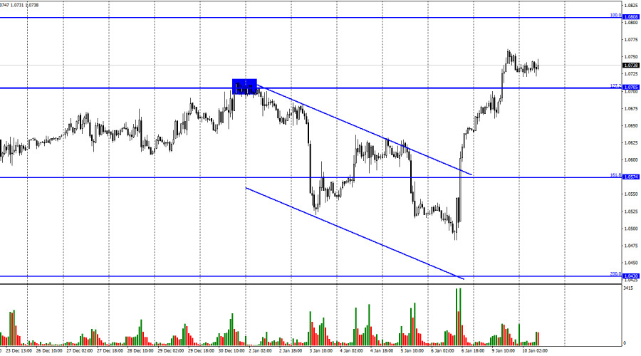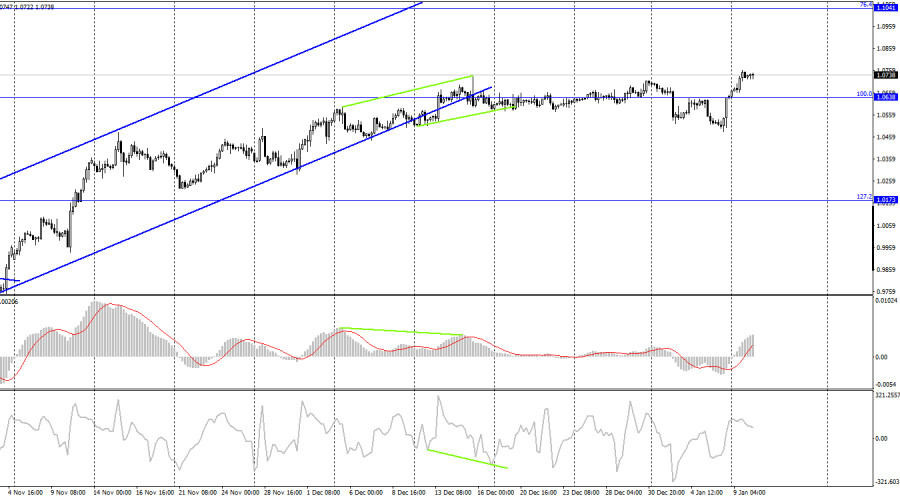 EUR/USD. 10 января. Трейдеры-медведи не долго наслаждались торговлейИнстаФорекс - Instaforex, 2 года назад Добрый день, уважаемые трейдеры! Пара EUR/USD в понедельник продолжала процесс роста и выполнила закрепление над уровнем коррекции 127,2%, 1,0705. Таким образом, рост европейской валюты может быть теперь продолжен в направлении следующего уровня Фибо 100,0%, 1,0808. Закрытие курса пары под уровнем 1,0705 сработает в пользу валюты США и некоторого падения в направлении коррекционного уровня 161,8%, 1,0574. Информационный фон в понедельник практически отсутствовал, но трейдеры все равно не сидели сложа руки, так как новостей и отчетов пятницы хватало для того, чтобы еще пару дней активно торговать. Напомню, что в пятницу вышли важные отчеты Nonfarm Payrolls и безработица, которые трейдеры сочли слабыми, хотя сделать это было очень сложно. Ведь безработица снизилась до 3,5%, а количество пэйроллов составило больше, чем ожидали увидеть сами трейдеры. Тем не менее доллар США начал быстро терять позиции, чем и занят до сих пор, хотя уже вторник. На мой взгляд, трейдеры рассчитывали увидеть более высокое значение пэйроллов, чем 223 тысячи. В этом моменте очень сложно сказать, кто прав, а кто нет. Я считаю, что ожидания трейдеров в целом были оправданы, а если они ждали еще более высокого значения, это не означает, что экономика США падает, скоро начнется рецессия и так далее. Как раз рецессии в Америке вполне можно избежать, потому что рынок труда стабильно растет, а уровень безработицы остается на своем минимальном за полвека значении. Поэтому лично я не понимаю, как можно было эти отчеты записать в пассив американской валюте. Тем не менее закрепление котировок над нисходящим трендовым коридором красноречиво свидетельствует о том, что трейдеры-быки вновь перешли в наступление, а настроение трейдеров является «медвежьим». Таким образом, ожидать дальнейший рост евровалюты вполне допустимо. На 4-часовом графике пара выполнила разворот в пользу валюты ЕС и закрепление над уровнем коррекции 100,0%, 1,0638. Само по себе закрепление над этим уровнем мало что значит, так как за последний месяц их было очень много. Поэтому я рекомендую больше внимания обращать на графический анализ часового графике. У индикатора CCI в данное время назревает «медвежья» дивергенция, которая может помочь вернуться в рынок трейдерам-медведям. Отчет Commitments of Traders (COT):