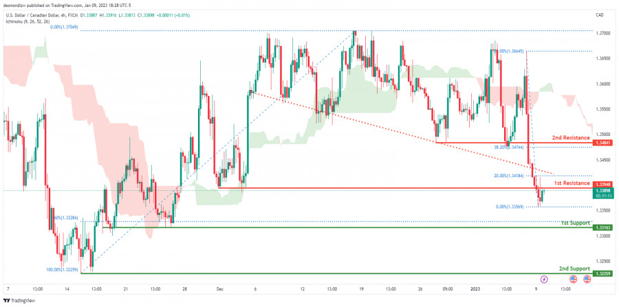 USD/CAD: ожидается дальнейшее развитие нисходящей тенденции. Прогноз на 10 января 2023ИнстаФорекс - Instaforex, 2 года назад На 4-часовом графике пара USD/CAD торгуется в медвежьем тренде. Цена пробила нисходящую линию тренда и движется ниже облака Ишимоку, что указывает на нисходящий импульс. Если этот импульс сохранится, ожидается, что цена направится к 1-му уровню поддержки 1.33163, где расположен уровень коррекции Фибоначчи 78.6%. В альтернативном сценарии цена может развернуться вверх, чтобы повторно протестировать 1-й уровень сопротивления 1.33948, который находится немного ниже 20% уровня коррекции Фибоначчи. Торговая рекомендация Вход: 1.33948 Условия для входа: повторное тестирование 1-го уровня сопротивления Тейк-профит: 1.32259 Условия для фиксации прибыли: 2-й уровень поддержки Стоп-лосс: 1.34841 Условия для активации ордера стоп-лосс: 2-й уровень сопротивления Материал предоставлен компанией InstaForex - www.instaforex.com |