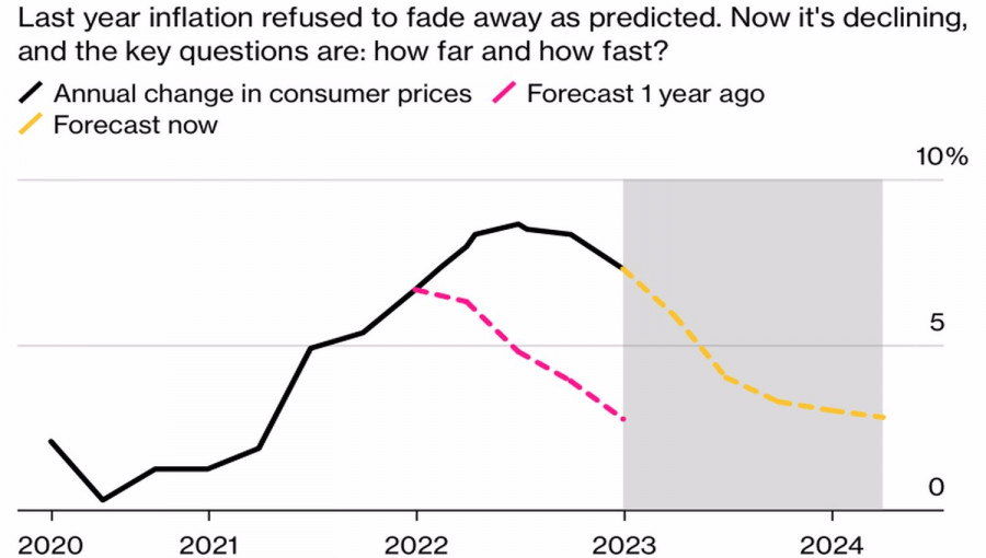 Золото подходит к зоне гравитацииИнстаФорекс - Instaforex, 2 года назад За последние пару месяцев золото выросло на 15%, озадачив многих инвесторов. TD Securities ищет тайного покупателя и считает, что без его участия цена драгметалла была бы на $150 за унцию ниже, чем сейчас. На мой взгляд, причины ралли XAUUSD следует искать в изменении мировоззрения ФРС и в утрате долларом США функции основного актива-убежища. Замедление американской инфляции снижает градус решительности ФРС. Центробанку уже не нужно произносить громких фраз, что для победы над высокими ценами он пожертвует экономикой. Напротив, отложенный эффект воздействия монетарной рестрикции на ВВП вынуждает его перейти к осторожности. Федрезерву лучше всего идти наощупь, в зависимости от поступающих данных и повышать ставку на 25 б.п. Именно такой сценарий срочный рынок считает базовым, выдавая ему почти 80%-ю вероятность в феврале. Динамика и прогнозы по инфляции в США Замедление скорости ужесточения денежно-кредитной политики ФРС ставит под удар доллар США, ведь разная скорость повышения ставок по сравнению с тем же ЕЦБ позволяет EURUSD расправить крылья. В результате золото на расстояние вытянутой руки приблизилось к так называемой зоне гравитации выше $1900 за унцию. Вхождение в нее, как правило, тянет драгметалл к психологически важному уровню в $2000. Поддержку XAUUSD оказывают страхи по поводу приближения рецессии в американской и мировой экономике. По мнению Всемирного банка, последняя ходит по лезвию бритвы спада из-за высокой инфляции, агрессивного ужесточения денежно-кредитной политики ведущими центробанками мира, вооруженного конфликта в Украине и вспышки COVID-19 в Китае. Организация снизила прогноз роста глобального ВВП на 2023 с июньских 3% до 1,7%. Если она окажется права, то текущее десятилетие станет первым с 1930-х, когда мировая экономика прошла сразу через две рецессии. Приближение глобального спада подставляет плечо драгметаллу не хуже, чем глобальные потрясения доллару США в 2022. Однако тогда американская валюта черпала силы в росте доходности казначейских облигаций на фоне движения инфляции в направлении своего пика и агрессивной монетарной рестрикции ФРС, то нынче другие времена. Jupiter Asset Management прогнозирует, что ставки по 10-леткам упадут ниже 2% в текущем году из-за высокого спроса на эти бумаги в условиях приближающейся рецессии и «голубиного» сдвига Федрезерва. Если все так и будет, золото продолжит ралли. Наверняка изменится отношение к нему со стороны поклонников физического актива. В 2022 отток капитала из специализированных биржевых фондов составил $3 млрд. В результате активы ETF сократились до $202,7 млрд. Их рост будет оказывать поддержку XAUUSD. Технически на недельном графике золото сломало нисходящий тренд благодаря комбинации паттернов Три индейца и Двойное основание. Пока котировки расположены выше пивот-уровня $1840, ситуацию полностью контролируют «быки». В связи с этим делаем акцент на покупки в направлении $1915 и $1965 за унцию. Материал предоставлен компанией InstaForex - www.instaforex.com |