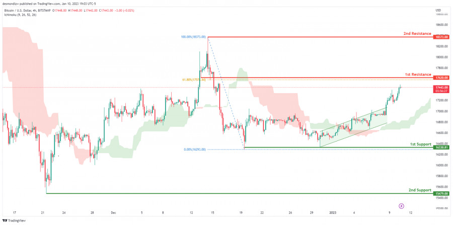 BTC/USD развивает бычий импульс. Прогноз на 11 января 2023ИнстаФорекс - Instaforex, 2 года назад На 4-часовом графике пара BTC/USD торгуется в бычьем тренде. В настоящее время цена находится выше облака Ишимоку и движется в восходящем канале, что указывает на бычий импульс. Если этот импульс сохранится, ожидается, что цена продолжит движение к 1-му уровню сопротивления 17620.00, где расположен уровень коррекции Фибоначчи 61.8%. В альтернативном сценарии цена может развернуться вниз к 1-му уровню поддержки 16330.81, соответствующему недавнему минимуму и области скопления ликвидности. Торговая рекомендация Вход: 17700.00 Условия для входа: вход в покупку по стопу немного выше области, где расположен 1-й уровень сопротивления Тейк-профит: 18373.00 Условия для фиксации прибыли: 2-й уровень сопротивления Стоп-лосс: 17136.00 Условия для активации ордера стоп-лосс: предыдущий минимум Материал предоставлен компанией InstaForex - www.instaforex.com |