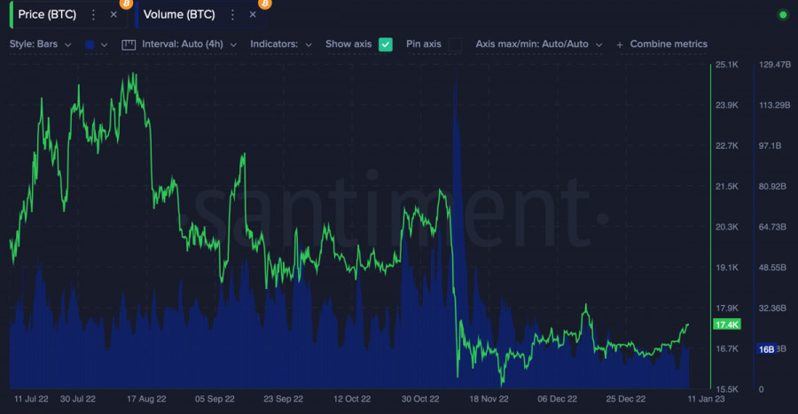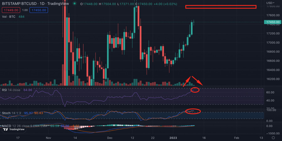 Рынок криптовалют оживает, а мировая экономика становится более устойчивой: череда важных событий продолжаетсяИнстаФорекс - Instaforex, 2 года назад Отправной точкой оттепели на рынке можно считать первое января, когда Биткоин начал восходящее движение. За 11 дней криптовалюте удалось достичь уровня $17,4k и уверенно закрепиться выше психологического уровня $17k. Среди ближайших целей актива стоит выделить уровни $17,8k и $18k. Несмотря на позитивные сдвиги, дневной график криптовалюты показывает не уверенный рост цены на низких объемах. Схожая ситуация наблюдалась в середине декабря, когда криптовалюта совершила ложный пробой уровня $18k и впоследствии начала снижаться. Однако, судя по последним известиям, текущий локальный восходящий тренд отличается от ценового движения в конце 2022 года. Объемы торгов на рынке криптовалют взлетели на 90% за последние сутки. Показатель достиг привычных отметок в районе $30-35 миллиардов. Напомним, что в период затяжной консолидации объемы не превышали $10 миллиардов. Еще одним позитивным сигналом стала очередная закупка криптовалют от крупных международных компаний. Google приобрел крупные объемы Solana по цене $10 и вошел в топ-13 крупнейших владельцев актива. Помимо этого, Morgan Stanley начал активно выкупать акции Grayscale Bitcoin Trust. По состоянию на 11 января фирма вложила более $3,5 миллиона в криптоактивы. Постепенно переходим к нейтральным новостям, а именно долгожданному выступлению Джерома Пауэлла, главы ФРС. По состоянию рынка можно сделать вывод, что чиновник был осторожен в высказываниях и не спровоцировал всплески волатильности. Ключевым тезисом Пауэлла стало признание факта, что мировая экономика стала гораздо устойчивей. В этом заявлении можно рассмотреть оммаж в сторону рынка труда, а также эффективной политики в отношении инфляции. Следующим ключевым событием для Биткоина и рынка криптовалют станет публикация отчетности по инфляции. Данные появятся в четверг, и аналитики прогнозируют замедление роста инфляции до 6,5% при текущих позициях на 7,1%. Учитывая утвердившуюся динамику замедления инфляции, можно предположить, что публикация отчетности уже заложена в цену финансовых инструментов. При этом прогнозы стали куда смелее, что повышает вероятность их ошибочности. Также нельзя забывать, что Биткоин локально перегрет, а потому четверг может стать отправной точкой локальной коррекции актива. Анализ BTC/USDКриптовалюта находится в непрерывном восходящем движении с первого января 2023 года. Активу удалось успешно преодолеть линию нисходящего тренда и уровень Фибо 0,236. Следующими целями монеты станут отметки $17,8k-$18k. Технические индикаторы Биткоина приближаются к зоне перекупленности, в особенности стохастик, который пробил уровень 60. RSI также близок к заходу в зону перекупленности. При этом не наблюдается рост покупательских объемов на дневном графике, что может указывать на завершение бычьего импульса. Схожее неуверенное движение можно заметить на дневном графике индекса S&P 500. В один день актив формирует крупнейшую свечу с конца ноября, но впоследствии проигрывает покупателям вблизи $4000. Учитывая это, можно прийти к выводу, что движение цены SPX - это импульсный всплеск торговой активности либо манипуляция маркетмейкера. ИтогиБиткоин постепенно проходит пиковую точку восходящего движения, так как покупател