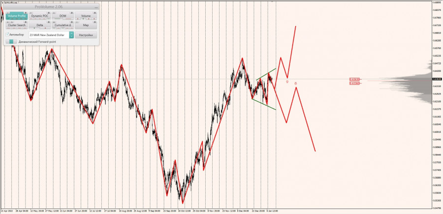 Долгосрочная тенденция: временная неопределенность. Максимальное скопление объемов текущего контракта расположено в диапазоне по котировкам 0.63360-0.63630. В настоящий момент по паре совершаются инвестиционные операции выше, указывая на силу покупателей.