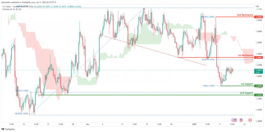 USD/CAD: ожидается усиление медвежьего импульса. Прогноз на 12 января 2023ИнстаФорекс - Instaforex, 2 года назад На 4-часовом графике пара USD/CAD торгуется в медвежьем тренде. Цена пробила нисходящую линию тренда и сейчас находится ниже облака Ишимоку, что указывает на медвежий импульс. Если этот импульс сохранится, ожидается, что цена направится к 1-му уровню поддержки 1.33569, где расположен недавний минимум. В альтернативном сценарии цена может развернуться вверх, чтобы повторно протестировать 1-й уровень сопротивления 1.34841, соответствующий уровень коррекции Фибоначчи 38.2%. Торговая рекомендация Вход: 1.34841 Условия для входа: повторное тестирование 1-го уровня сопротивления Тейк-профит: 1.32259 Условия для фиксации прибыли: 2-й уровень поддержки Стоп-лосс: 1.36645 Условия для активации ордера стоп-лосс: 2-й уровень сопротивления Материал предоставлен компанией InstaForex - www.instaforex.com |