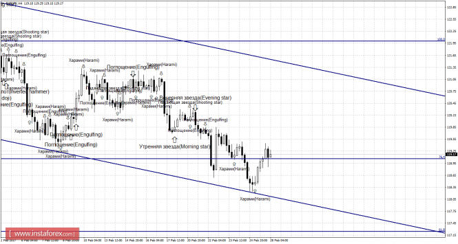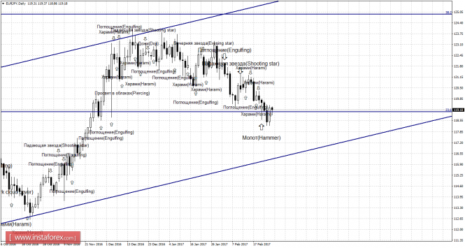 Свечной анализ EUR/JPY на 28 февраляИнстаФорекс - Instaforex, 8 лет назад Daily Котировки пары выполнили разворот в пользу европейской валюты без образования бычьей свечной формации и закрепление над уровнем коррекции 23,6% - 119,07. Таким образом, рост курса пары может быть продолжен в направлении следующего коррекционного уровня 38,2% - 124,91. Образование медвежьей свечной формации позволит рассчитывать на разворот в пользу японской иены и некоторое падение котировок. Такая формация будет трактоваться как коррекционная, так как равноудаленный канала по-прежнему имеет направление «вверх». Закрепление пары под уровнем Фибо 23,6% повысит вероятность продолжения падения в направлении следующего уровня коррекции 0,0% - 109,56. Сетка Фибо построена по экстремумам от 8 декабря 2014 года и 24 июня 2016 года. 4h Слабая бычья формация «Харами» позволила котировкам на 4-часовом графике выполнить разворот в пользу валюты ЕС и закрепление над коррекционным уровнем 76,4% - 119,06. В итоге рост котировок может быть продолжен сегодня в направлении следующего уровня коррекции 100,0% - 122,00. Образование 28 февраля медвежьей формации позволит трейдерам ожидать разворот в пользу японской валюты и будет являться трендовым сигналом, исходя из направления равноудаленного канала. Закрепление котировок под уровнем Фибо 76,4% аналогично сработает в пользу падения пары в направлении коррекционного уровня 61,8% - 117,25. Сетка Фибо построена по экстремумам от 24 июня 2016 года и 24 июня 2016 года. Уточнения: Слабые свечные формации будут отмечаться обычным текстом и размером стрелок. Сильные свечные формации будут отмечаться более жирным текстом и большим размером стрелок. Материал предоставлен компанией InstaForex - www.instaforex.com |