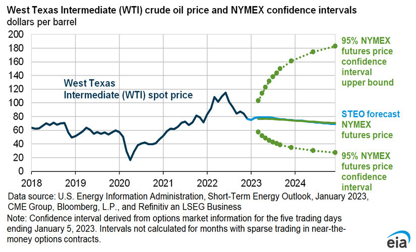 Нефть: покупающим дно – второе дно в подарок?ИнстаФорекс - Instaforex, 2 года назад Здравствуйте, уважаемые коллеги! Рынок нефти остаётся в центре нашего внимания, и в этой статье мы рассмотрим новые данные, поступившие из Агентства Энергетической Информации США, Отчёта по обязательствам трейдеров СОТ, ряда других источников, а также техническую картину происходящего. Говоря о перспективах рынка нефти, следует принять во внимание, что данный актив по сути является ключевым в геополитическом противостоянии США и союзников с одной стороны и России с другой. И речь здесь вовсе не о доходах России от экспорта энергоносителей, хотя и о них тоже, а о глобальном доминировании США и возможности создавать деньги из воздуха. Снижение показателей потребительской инфляции до 6.5% в США и 9.1% в еврозоне явилось отражением снижением котировок нефти, которые оказали давление на сопутствующие группы товаров, в том числе и продовольствие. От того, сколько стоит нефть, зависит и политика Центробанков, поэтому борьба за данный ресурс предстоит нешуточная. На этой неделе Агентством Энергетической Информации США (US EIA) был опубликован очередной краткосрочный прогноз цен. Прежде всего следует отметить, что прогноз цены нефти на 2023 год всего за один месяц был пересмотрен в сторону снижения на 9 долларов. Если в декабрьском прогнозе предполагалось, что средняя цена нефти марки Брент будет находиться на уровне 92 доллара за баррель, то в январском прогнозе уровень сместился вниз до 83 долларов за бочку. В свою очередь, прогноз сорта североамериканской нефти марки WTI, доступной в терминале компании InstaForex под тиккером #Cl, составляет 77 долларов (рис.1). рис.1: Прогноз цены нефти WTI от USEIA и трейдеров NYMEX При этом баланс спроса и предложения был смещён в сторону предложения. Вот что пишет по этому поводу Агентство Энергетической Информации США: • Мировые рынки жидкого топлива. Согласно нашему прогнозу, мировое производство жидкого топлива достигнет в среднем 102,8 млн баррелей в сутки (б/с) в 2024 году по сравнению со 100,0 млн баррелей в сутки в 2022 году, что обусловлено значительным ростом добычи за пределами ОПЕК. Однако неопределённость в отношении поставок нефти из России сохранится, особенно в начале 2023 года. • Мы ожидаем, что мировое потребление жидких видов топлива в среднем вырастет с 99,4 млн баррелей в сутки в 2022 году до 102,2 млн баррелей в сутки в 2024 году. Однако ослабление ограничений в связи с COVID-19 в Китае увеличивает неопределённость прогнозов спроса. Учитывая, что в нашем прогнозе мировая добыча нефти превышает потребление, мы ожидаем, что мировые запасы нефти увеличатся в течение следующих двух лет. • Цены на сырую нефть. Мы прогнозируем, что цена сырой нефти Brent в среднем составит 83 доллара за баррель в 2023 году, что на 18% ниже, чем в 2022 году, и продолжит снижаться до 78 долларов за баррель в 2024 году, по мере роста мировых запасов нефти, оказывая понижательное давление на цены на сырую нефть. Таким образом, можно констатировать, что основным фактором, господствующем на рынке нефти в 2023 году, будет неопределённость на фоне роста производства в странах, не связанных соглашением OPEC+. С чем я всех нас и поздравляю! Раз уж аналитики US EIA, имеющие доступ к ресурсам правительства и огромный опыт прогнозирования, меняют свои прогнозы каждый месяц и говорят о высокой неопределён