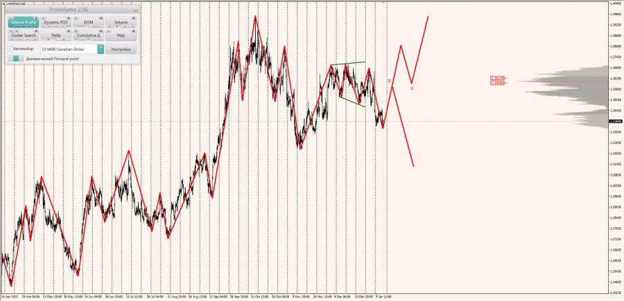 Долгосрочная тенденция: в шорт. Максимальное скопление объемов текущего контракта расположено в диапазоне по котировкам 1.35990-1.36270. В настоящий момент по паре совершаются инвестиционные операции ниже, указывая на силу продавцов.
