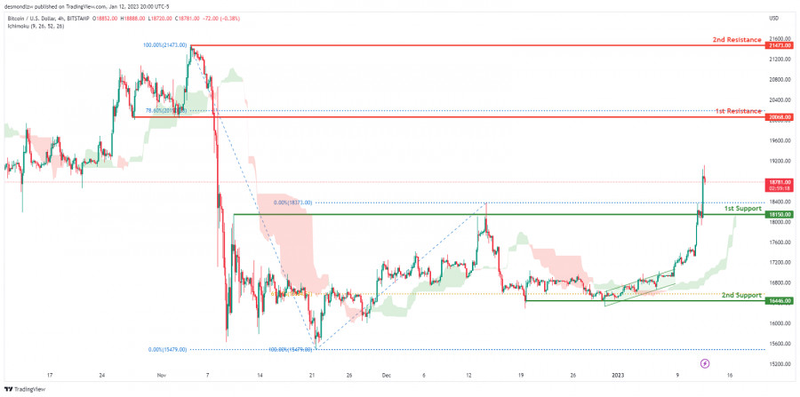 BTC/USD торгуется с повышением. Прогноз на 13 января 2023ИнстаФорекс - Instaforex, 2 года назад На 4-часовом графике пара BTC/USD торгуется в бычьем тренде. Цена пробила восходящий канал и в настоящее время находится выше облака Ишимоку, что указывает на бычий импульс. Если этот импульс сохранится, ожидается, что цена продолжит рост к 1-му уровню сопротивления 20068.00, соответствующему уровню коррекции Фибоначчи 78.6%. В альтернативном сценарии цена может развернуться вниз, чтобы повторно протестировать 1-й уровень поддержки 18150.00, где расположен предыдущий максимум. Торговая рекомендация Вход: 18150.00 Условия для входа: повторное тестирование 1-го уровня поддержки Тейк-профит: 20068.00 Условия для фиксации прибыли: 1-й уровень сопротивления Стоп-лосс: 16446.00 Условия для активации ордера стоп-лосс: 2-й уровень поддержки Материал предоставлен компанией InstaForex - www.instaforex.com |