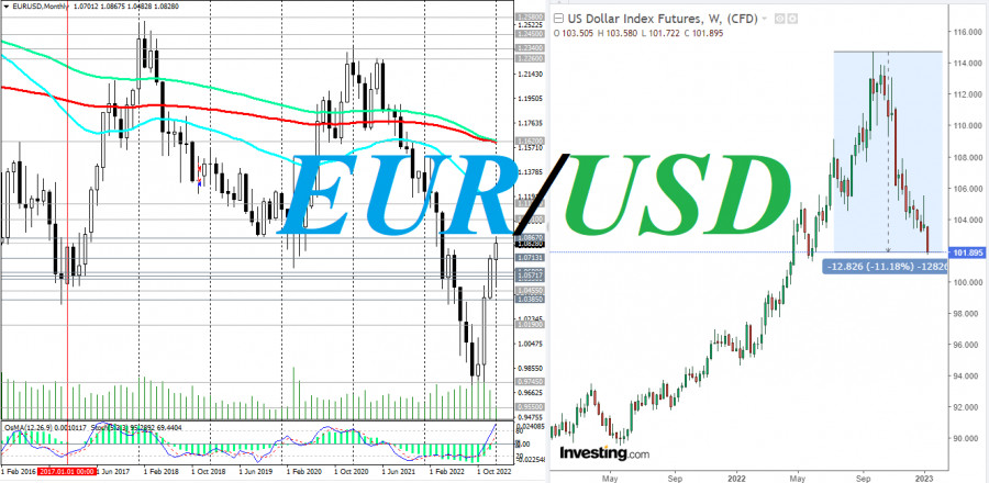 EUR/USD: краткие итоги и ближайшие перспективыИнстаФорекс - Instaforex, 2 года назад Доллар тотально слабеет. Опубликованные вчера данные по инфляции в США укрепили мнение участников рынка, что ФРС продолжит снижать темпы повышения процентной ставки, а на заседании 31 января и 1 февраля повысит ставку лишь на 0,25% (после повышения на 0,50% в декабре и на 0,75% месяцами ранее), а затем еще более замедлит темпы ужесточения своей политики и, возможно, пойдет на ее смягчение в ближайшем будущем. Как сообщили в Бюро трудовой статистики страны, в декабре годовой индекс потребительских цен вновь снизился, до 6,5% с 7,1% месяцем ранее, а базовый CPI – до 5,7%, с 6% в ноябре. Эти данные вышли после опубликованных неделей ранее данных с рынка труда США и отчета ISM, который показал, что индекс PMI в сфере услуг вышел со значением за декабрь в 49,6, оказавшись хуже прогноза в 55,0 и предыдущего значения 56,5. Хотя, ВВП США вырос в 3-м квартале на 3.2% (в годовом исчислении), остановив так называемую «техническую рецессию» или спад в течение 2 кварталов подряд, данные по отдельным важнейшим секторам американской экономики свидетельствуют о ее замедлении, находясь под давлением жёсткой политики ФРС. Несмотря на довольно хорошее состояние рынка труда, другие данные дают основание руководителям ФРС пересмотреть свой жесткий подход в отношении параметров монетарной политики в сторону ее смягчения. Повышать ставки при ухудшении макро экономических показателей – это недопустимая ошибка, говорят экономисты. По итогам уходящей недели доллар ослаб, а его индекс DXY снизился более чем на 1,5%. На момент публикации данной статьи фьючерсы DXY торговались вблизи отметки 101.90, на 175 пунктов ниже цены закрытия предыдущей недели, неумолимо двигаясь в сторону психологической отметки 100.00. Между тем сегодня покупатели доллара смогут, вероятно, получить некоторую передышку, если на фоне публикации (в 15:00 GMT) предварительного индекса потребительского доверия Мичиганского университета начнется фиксация прибыли в части коротких позиций по доллару. Данный индекс является опережающим индикатором потребительских расходов, на которые приходится большая часть общей экономической активности. Он также отражает уверенность американских потребителей в экономическом развитии страны. Высокий уровень говорит о росте экономики, в то время как низкий указывает на стагнацию. Рост показателя, как ожидается до 60,5 с 59,7 в прошлом месяце, должен позитивно отразиться на USD. Примерно в это же время, т.е. в начале американской торговой сессии, ФРС опубликует индекс общих инфляционных ожиданий (Index of Common Inflation Expectations – CIE) за 3-й квартал, который используется экономистами ФРС в качестве индикатора инфляции и ее близости к таргетируемому ЦБ США уровню. Начало же следующей недели ознаменуется выходным днем в США: в понедельник там отмечают национальный праздник (День Мартина Л. Кинга), банки и биржи страны будут закрыты, а публикации американской макро статистики в этот день также не намечается. Поэтому в динамике валютных пар трейдеры, вероятно, будут ориентироваться на общий новостной фон и макро статистику, поступающую из других регионов и стран мира (о важных событиях следующей недели см. в Важнейшие экономические события недели 16.01.2023 – 22.01.2023). Что же касается основного конкурента доллара на валютном рынке евро, то сег