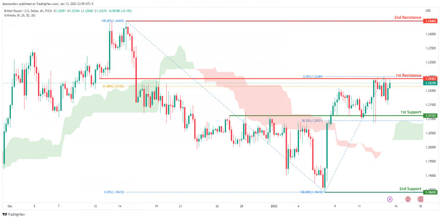GBP/USD развивает бычий импульс. Прогноз на 16 января 2023ИнстаФорекс - Instaforex, 2 года назад На 4-часовом графике пара GBP/USD торгуется в бычьем тренде. В настоящее время цена находится выше облака Ишимоку, что указывает на восходящий импульс. Если бычий импульс сохранится, ожидается, что цена продолжит рост, пробив 1-й уровень сопротивления 1.22423, который находится немного выше уровня коррекции Фибоначчи 61.8%, прежде чем направиться ко 2-му уровню сопротивления 1.24465, где расположен предыдущий уровень свинг-хай. В альтернативном сценарии цена может развернуться вниз к 1-му уровню поддержки 1.21123, соответствующему уровню коррекции Фибоначчи 38.2%. Торговая рекомендация Вход: 1.22489 Условия для входа: вход в покупку по стопу немного выше 1-го уровня сопротивления с целью поймать бычий импульс Тейк-профит: 1.24465 Условия для фиксации прибыли: 2-й уровень сопротивления и область скопления ликвидности Стоп-лосс: 1.20843 Условия для активации ордера стоп-лосс: недавний уровень свинг-лоу и область, расположенная немного ниже 1-го уровня поддержки Материал предоставлен компанией InstaForex - www.instaforex.com |