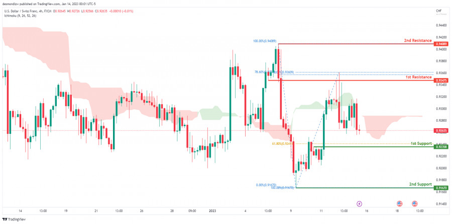 На 4-часовом графике пара USD/CHF торгуется в медвежьем тренде. Цена находится ниже облака Ишимоку, что указывает на нисходящий импульс. Если медвежья тенденция продолжится, ожидается, что цена направится вниз, чтобы повторно протестировать 1-й уровень поддержки 0.92358, где расположен уровень коррекции Фибоначчи 61.8%. В альтернативном сценарии цена может направиться к 1-му уровню сопротивления 0.93475, соответствующему уровню коррекции Фибоначчи 78.6%.