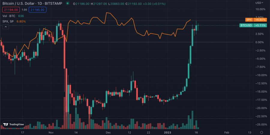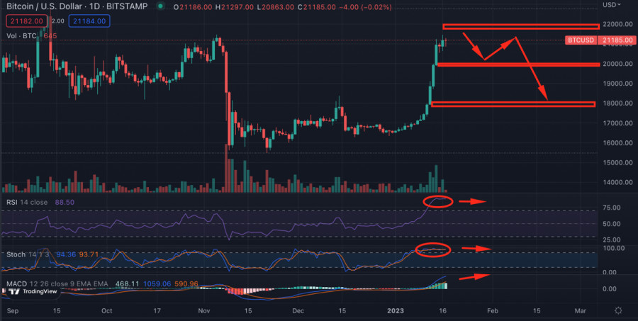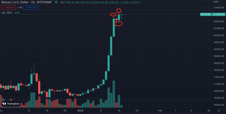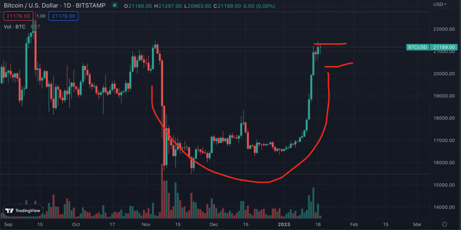 Bitcoin сохраняет позиции вблизи $21k: стоит ожидать продолжения бычьего движения?ИнстаФорекс - Instaforex, 2 года назад Биткоин приостановил бычий забег вблизи уровня $21k из-за существенного роста медвежьих объемов. Продавцы третий день кряду сохраняют сильное давление на цену актива, но пока безуспешно. Покупателям удается поддерживать котировки BTC/USD выше $21k. При этом цена Bitcoin трижды тестировала область $20,5k-$20,8k за последние три дня, что может указывать на ее вероятный пробой в ближайшее время. Вместе с тем уверенные позиции покупателей могут позволить криптовалюте продолжить восходящее движение до уровней $21,5k-$22k. Аналитики CryptoQuant считают, что далеко не все институциональные инвесторы разделяют всеобщую эйфорию. Эксперты компании пришли к выводу, что значительная часть крупных инвесторов ожидает увеличения объемов ОТС-торговли, чтобы вернуться на рынок. При этом Биткоин продолжает обновлять исторический максимум сложности майнинга. Показатель вырос на 10,3% и превысил отметку в 270 EH/s. Удержание цены выше $20k облегчает экономическое положение майнинг-фирм, но дороговизна энергоресурсов может сподвигнуть компании к продаже BTC по выгодной цене. Bitcoin и рынок акцийАктивизация торговой активности также наблюдается на рынке акций, где основные активы также показывают уверенный рост. Флагман рынка, индекс S&P 500, сохраняет корреляцию с Bitcoin и обновляет локальные максимумы. Вероятней всего, текущая динамика движения цены фондового рынка сохранится, так как в Goldman Sachs рапортуют об активном закрытии шортовых позиций. После многомесячного падения такие телодвижения инвесторов выглядят как адаптация к новым реалиям. А это означает, что после нескольких крупных ликвидаций вера в бычий тренд укрепилась. Это означает, что в ближайшее время стоит ожидать локальной коррекции или смены тренда к локальным минимумам. Анализ BTC/USDБиткоин третий день кряду сохраняет позиции вблизи уровня $21k. Также криптовалюта находится в непрерывном восходящем тренде 17 дней подряд. Эксперты BBG отмечают, что индекс относительной силы на дневном таймфрейме достиг зоны двухгодичного экстремума. Это подтверждает наше заключение о локальной перекупленности Биткоина. Несмотря на это, покупательские объемы остаются на высоком уровне, и неудачные попытки медведей продавить цену ниже $21k тому явное подтверждение. При этом стоит отметить, что цена замедлила восходящее движение и столкнулась с крупными объемами продаж. В первую очередь это связано с достижением ключевой зоны, откуда началось снижение цены BTC к локальному дну из-за краха FTX. Также не стоит забывать, что индекс страха и жадности только начал расти в сторону жадности и на рынке остается большой пласт медведей, готовых открывать шортовые позиции. Рынок действовал определенным образом почти 10 месяцев, и одно мощное бычье ралли не изменит ситуацию быстро. На дневном таймфрейме завершается формирование бычьего паттерна "кружка с ручкой". Цена завершает элемент "ручка", после чего можно утверждать, что Биткоину по силам достичь уровня $28k по итогам текущего бычьего забега. При этом технические метрики криптовалюты остаются в зоне перекупленности, но все чаще разворачиваются во флетовом направлении. Это связано с растущим давлением продавцов, а также перекупленностью криптовалюты. ИтогиБиткоин уверенно удерживае
