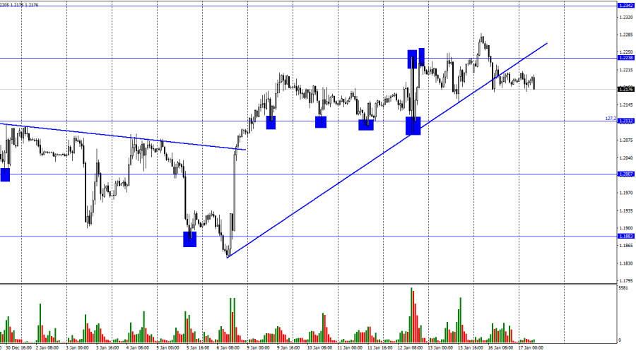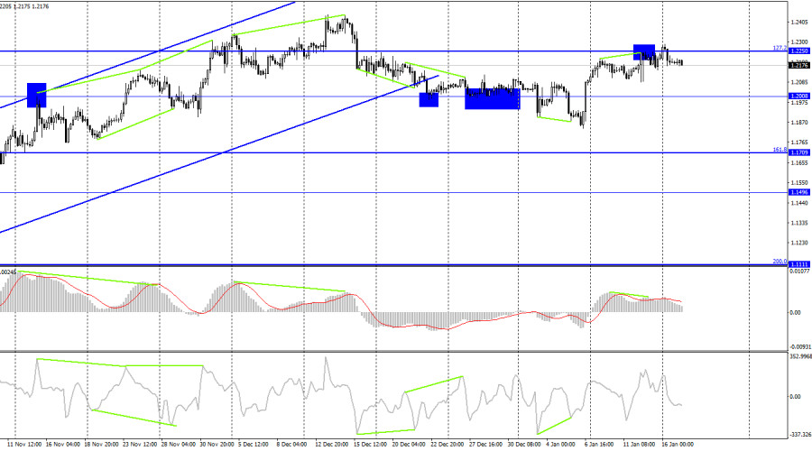GBP/USD. 17 января. Выступление Эндрю Бейли может пролить свет на ДКП Банка АнглииИнстаФорекс - Instaforex, 2 года назад Добрый день, уважаемые трейдеры! На часовом графике пара GBP/USD в понедельник выполнила новый разворот в пользу американского доллара и закрепление под уровнем 1,2238 и восходящей трендовой линией. Таким образом, настроение трейдеров могло поменяться на «медвежье», а падение может продолжаться в направлении коррекционного уровня 127,2% - 1,2112. Информационный фон в понедельник отсутствовал, а в США вообще был выходной – День Мартина Лютера Кинга. Фондовые и финансовые площадки были закрыты. Падение активности трейдеров во второй половине дня объясняется этой причиной. Сегодня ситуация более интересная. В Великобритании вышли отчеты по безработице (3,7% в ноябре) и заработным платам (+6,4% в ноябре). Реакция трейдеров была минимальной, так как значения этих показателей практически не отличались от ожиданий трейдеров. Сегодня в течение дня выступит с речью губернатор Банка Англии Эндрю Бейли, и это будет по-настоящему интересным событием. Напомню, что многие экономисты считают весьма вероятным завершение цикла повышения ставок Банком Англии в ближайшие месяцы. Несмотря на то что инфляция продолжает зашкаливать, британская экономика может столкнуться с серьезной рецессией, а регулятор может отступить от своих планов по снижению ее до 2%. Или отложить их на некоторое время. Уже сейчас вероятность повышения процентной ставки в феврале на 0,50% не является высокой. Таким образом, Эндрю Бейли может заставить трейдеров поверить в неизменность курса ДКП Банка Англии или же, наоборот, признать, что темпы повышению процентной ставки будут снижаться и далее. При первом варианте британец может вновь вырасти, при втором – на рынок могут вернуться трейдеры-медведи. Я думаю, что падение евро и фунта на этой неделе вероятно, так как быки не удержали сразу две трендовые линии, а оба инструмента часто показывают схожую динамику. На 4-часовом графике пара выполнила рост к уровню коррекции 127,2% - 1,2250. Тут же образовалась «медвежья» дивергенция у индикатора MACD. Таким образом, пара может выполнить разворот в пользу американской валюты и начать процесс падения в направлении уровня 1,2008. Закрытие котировок над 1,2250 отменит дивергенцию и повысит вероятность дальнейшего роста в направлении следующего уровня Фибо 100,0% - 1,2674. Отчет Commitments of Traders (COT):