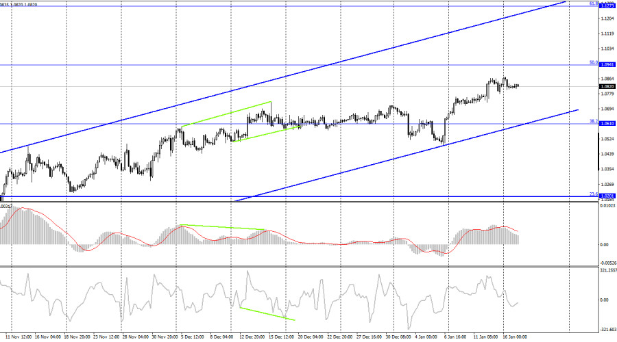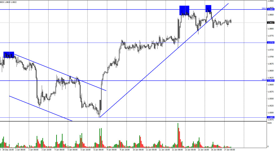 EUR/USD. 17 января. День Мартина Лютера Кинга прошел спокойноИнстаФорекс - Instaforex, 2 года назад Добрый день, уважаемые трейдеры! Пара EUR/USD в понедельник выполнила новый рост к уровню коррекции 200,0% - 1,0869, отбой от него, разворот в пользу американской валюты и закрепление под восходящей трендовой линией. Таким образом, настроение трейдеров могло измениться на «медвежье». В этом случае падение котировок продолжится в направлении уровня 1,0750. Закрытие курса пары над уровнем 1,0869 сработает в пользу валюты ЕС и возобновления роста в направлении следующего уровня 1,1000. Информационный фон в понедельник отсутствовал. На этой неделе будет несколько интересных событий, которые могут повлиять на настроение трейдеров, но все они запланированы на вторую половину недели. Я не думаю, что вторая оценка отчета по инфляции за декабрь в Евросоюзе впечатлит трейдеров. Я не думаю, что их впечатлят американские отчеты по промышленному производству или розничным продажам. На все эти данные может последовать реакция, но вероятность этого не больше 30%. В данное время очень важно, чтобы прогноз графического анализа и прогноз по информационному фону совпадал. Графический анализ указывает на весьма вероятное падение, поэтому на этой неделе мы должны получить информационный фон, который поддержит трейдеров-медведей. Для этого члены FOMC должны щеголять «ястребиной» риторикой, а статистика из Америки – превысить ожидания трейдеров. Я сомневаюсь и в первом, и во втором условии. Также поддержка медведям может поступить из Евросоюза, но на это еще меньше надежд, так как ЕЦБ настроен сейчас на повышение ставки на двух ближайших заседаниях на 0,50%. Кристин Лагард вряд ли в четверг и пятницу вдруг заявит, что от «ястребиного» сценария придется отказаться. Таким образом, графический сигнал на продажу у нас имеется, но информационный фон может отменить его. На 4-часовом графике пара выполнила разворот в пользу валюты ЕС и продолжает процесс роста в направлении коррекционного уровня 50,0% - 1,0941. Отбой котировок от этого уровня сработает в пользу валюты США и некоторого падения в направлении уровня Фибо 38,2% - 1,0610. Восходящий трендовый коридор вновь характеризует настроение трейдеров как «бычье». Сильного падения евровалюты до закрытия под коридором я не жду. Отчет Commitments of Traders (COT):