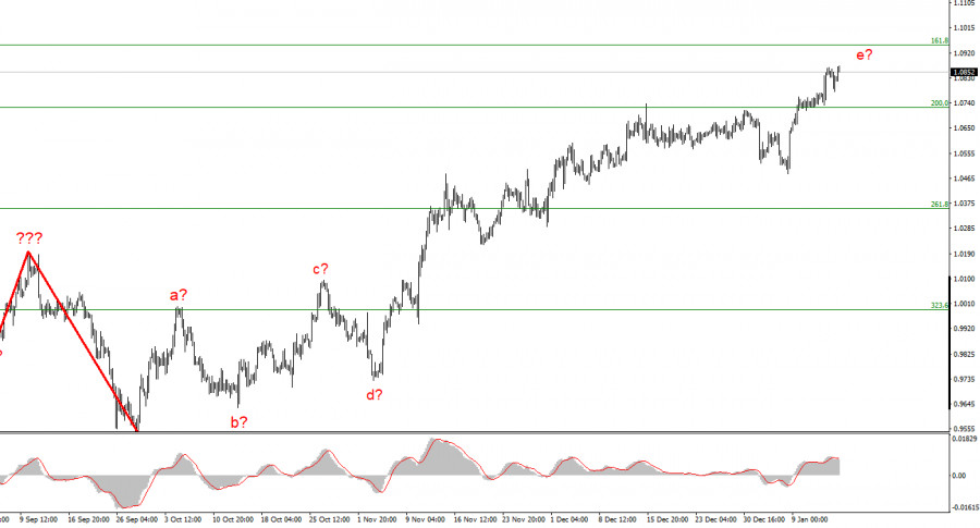 Анализ EUR/USD. 18 января. Евро еще не исчерпал потенциал своего роста.ИнстаФорекс - Instaforex, 2 года назад Волновая разметка 4-часового графика для инструмента Евро/Доллар по-прежнему выглядит вполне убедительно и по-прежнему усложняется, а весь повышательный участок тренда продолжает оставаться достаточно сложным. Он принял ярко выраженный коррекционный(хотя его протяженность больше подходит для импульсного участка) и сильно протяженный вид. Мы получили сложную коррекционную структуру волн a-b-c-d-e, в которой волна e имеет гораздо более сложный вид, чем первые четыре волны. Если текущая волновая разметка верна, то построение этой структуры может близиться к своему завершению, так как пик волны e намного превышает пик волны с. В этом случае нас ожидает построение минимум трех волн вниз, поэтому я по-прежнему готовлюсь к снижению инструмента. На первых двух неделях года спрос на евровалюту вновь рос, а инструмент за этот период времени сумел лишь немного отойти вниз от ранее достигнутых пиков. Новая попытка прорыва отметки 1,0721, что соответствует 127,2% по Фибоначчи, оказалась удачной, и теперь волна e может принять еще более протяженный вид. К сожалению, построение коррекционного участка тренда опять откладывается. Дивергенция ставок может поддерживать евро до заседания ЕЦБ.Инструмент Евро/Доллар во вторник снизился на 30 базовых пунктов. Такие ценовые изменения практически не оказывают влияния на текущую волновую разметку, так как они слишком слабы. В то же время, я не могу сопоставить новостной фон с текущими движениями инструмента, так как сами движения носят больше горизонтальный характер, а новостной фон практически отсутствует. Вчера только отчет по немецкой инфляции мог быть интересен участникам рынка. Однако вторая оценка ничем не отличалась от первой, и рынок понимал, какого значения ему следует ожидать. Снижение европейской валюты во второй половине дня можно засчитать, как реакцию на утренний отчет по инфляции в Германии, но чем тогда объяснить утреннее повышение инструмента? Я считаю, что движения евро сейчас не стоит пытаться увязать с новостным фоном. Рынок отталкивается от других факторов. На мой взгляд рынок уже четко для себя решил, что спрос на валюту ЕС нужно повышать, так как ЕЦБ с вероятностью 90% повысит ставку на 50 базисных пунктов в феврале, а ФРС – на 25. Таким образом, впервые за долгое время разрыв между ставками ЕЦБ и ФРС будет сокращаться, а не увеличиваться. Этот фактор и может поддерживать высокий спрос на валюту ЕС. Если это действительно так, то сейчас мы уже наблюдаем реакцию на повышение ставки ЕЦБ через две недели. Когда же наступит день заседания европейского регулятора, этот фактор может быть уже отыгран и мы увидим снижение инструмента. Это снижение может совпасть с завершением волны e, которая уже приняла слишком протяженный вид. Если мое предположение верно, то сейчас строится волна 5 в e. Значит в любой момент повышение может оборваться. Общие выводы.Исходя из проведенного анализа, я делаю вывод, что построение восходящего участка тренда близится к своему завершению. Таким образом, сейчас можно рассматривать продажи с целями, расположенными около расчетной отметки 0,9994, что соответствует 323,6% по Фибоначчи, по сигналам MACD «вниз». Существует вероятность усложнения повышательного участка тренда и при