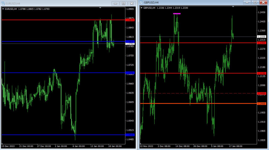 Торговый план по EUR/USD и GBP/USD на 19.01.2023ИнстаФорекс - Instaforex, 2 года назад Несмотря на замедление инфляции в Великобритании с 10,7% до 10,5%, фунт постепенно рос. Хотя снижение инфляции, а она замедляется уже второй месяц кряду, явно намекает на возможность более сдержанного роста ставки рефинансирования Банка Англии. А ведь именно такие ожидания в отношении действий Федеральной Резервной Системы совсем недавно стали поводом для довольно внушительного ослабления доллара. Более того, в ходе минувшего заседания правления Банка Англии сразу два члена правления высказались за снижение ставки рефинансирования. Так что все указывает на то, что не только американский регулятор в скором времени завершит свой цикл роста процентных ставок, но и Банк Англии. А значит, повода для существенного роста фунта нет. Просто инвесторы, видимо, еще не до конца осознали этот факт. Инфляция (Великобритания): Аналогичная ситуация складывается и в зоне евро, где инфляция замедлилась с 10,1% до 9,2%. Но, как и фунт, единая европейская валюта росла. Правда, заметно скромнее, так как публиковались итоговые данные, которые лишь подтвердили предварительную оценку, давно уже рынком учтенную. Инфляция (Европа): Но основной причиной ослабления доллара в ходе европейской сессии была, конечно же, американская статистика, прогнозы по которой носили исключительно негативный характер. Так, темпы роста розничных продаж должны были замедлиться с 6,5% до 5,0%, а промышленного производства с 2,5% до 1,8%. Так что некоторый пессимизм в отношении доллара был вполне оправданным. Особенно когда стало известно, что предыдущие данные пересмотрели в худшую сторону. Розничные продажи до 6,0%, а промышленное производство до 2,2%. И если посмотреть на итоговые данные по промышленности, то все становится еще хуже, так как темпы роста замедлились до 1,6%. Но после публикации данных доллар начал расти. Все дело в розничных продажах, которые с учетом пересмотра остались неизменными. А ведь именно розничные продажи имеют первостепенное значение, так как наилучшим образом отражают состояние потребительской активности, являющейся локомотивом экономического роста. И данные оказались существенно лучше ожиданий, что будет внушать уверенность в том, что Соединенные Штаты смогут избежать рецессии. Розничные продажи (Соединенные Штаты): В первую очередь из-за инфляционной динамики в Старом Свете потенциал роста фунта с единой европейской валютой крайне ограничен. Скорее инвесторы должны будут постепенно начать пересматривать свои позиции в пользу американской валюты. Но вот расти ей сегодня особо некуда. Общее число заявок на пособия по безработице в Соединенных Штатах может вырасти на 8 тыс. Рост крайне несущественный, но прогнозы все равно носят негативный характер, так что основания для роста доллара, по крайней мере сегодня, нет. Следовательно, рынок, скорее всего, будет консолидироваться в районе текущих значений. Число повторных заявок на пособия по безработице (Соединенные Штаты): Несмотря на переменную болтанку по паре EURUSD, на рынке по-прежнему сохраняется застой. Он выражен в амплитудном колебании примерно в 100 пунктов, на пике восходящего цикла. Можно предположить, что отсутствие полноразмерной коррекции может привести к последующей болтанке в установленном ценовом диапазоне. Что касается валют