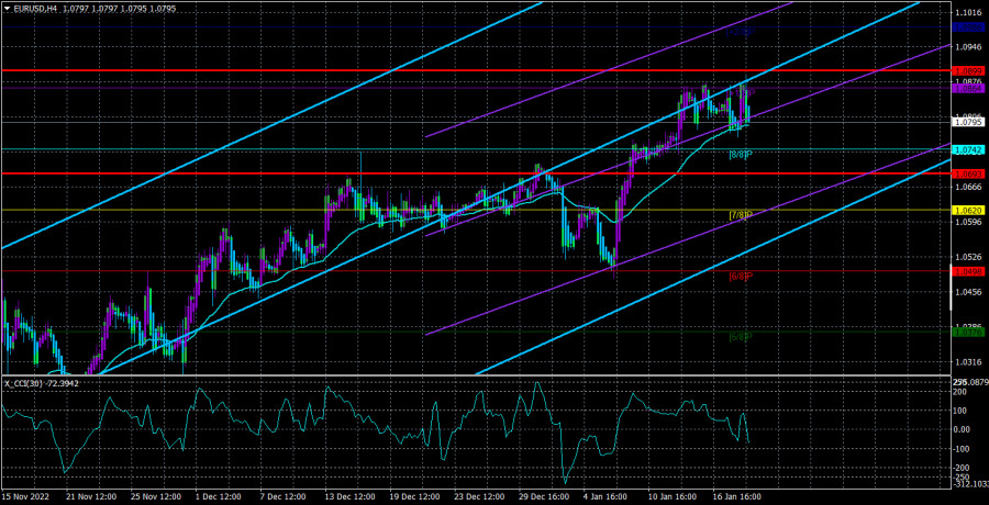 Обзор пары EUR/USD. 19 января. Спасибо, Филип ЛейнИнстаФорекс - Instaforex, 2 года назад Валютная пара EUR/USD в среду возобновила восходящее движение после того, как скорректировалась к скользящей средней линии. В очередной раз мы увидели абсолютно стандартную техническую картину: евровалюта микроскопически откатилась вниз, после чего возобновила движение вверх. Самое интересное, что вчера не было никаких причин для этого, но что поделать, если рынок любой инфоповод рассматривает в пользу евровалюты? Утром в ЕС был опубликован отчет по инфляции за декабрь. Казалось бы, важный отчет, но! Это была вторая, финальная оценка показателя за декабрь, которая ничем не отличалась от первой. Более того, инфляция, согласно отчету, снизилась до 9,2%, то есть на целых 0,9%. Такие темпы падения можно назвать «очень быстрыми». Однако падение инфляции – это «голубиный» фактор для европейской валюты, потому что означает потенциально более быстрый отказ ЕЦБ от агрессивного повышения ключевой ставки! Напомним, что в прошлом году доллар США перестал расти, именно когда инфляция начала замедляться! Таким образом, рост европейской валюты ну никак не мог быть связан с этим отчетом. Точнее, рынок его мог интерпретировать, как хотел, и, вероятно, именно так он и сделал. В очередной раз мы увидели рост евровалюты, когда для этого не было никаких оснований. На данный момент по-прежнему нет ни одного торгового сигнала на продажу, а мы по-прежнему ожидаем сильной нисходящей коррекции. И чем выше растет евро, тем ниже он потом упадет, как только рынок вспомнит, что можно не только покупать, но и продавать. Но так как сигналов на продажу нет, то мы не советуем открывать короткие позиции в данное время. Три торговых дня на этой неделе показали, что ничего в настрое рынка не изменилось. Он все также нацелен исключительно на покупки евро, а когда берет паузу, то сил у медведей не хватает даже на нормальную коррекцию. Обратите внимание на 24-часовой ТФ, на нем отлично видно, что практически безоткатный рост составляет уже 1100 пунктов. Для евро такое расстояние является значимым. Главный экономист ЕЦБ считает, что ставки должны быть выше. Никто и не спорит...Помимо абсолютно ничего не значащего отчета по инфляции, на этой неделе состоялось выступление главного экономиста ЕЦБ Филипа Лейна. Его речь не блистала никакой новой информацией. Господин Лейн лишь заявил, что ставки, безусловно, должны быть гораздо выше нынешних. И, похоже, что рынок учел и это событие, обрадовавшись, что получил еще один повод для покупок. Ведь, по сути, факт необходимости дальнейшего ужесточения монетарной политики известен всем и уже далеко не первый месяц. Мы не отрицаем, что процесс ужесточения монетарной политики – это длительный процесс, на протяжении которого рынок может отрабатывать соответствующий фундаментальный фон. Но сколько еще будет расти евровалюта на основании одного лишь фактора сокращающейся дивергенции ставок? К тому же ставки ФРС и ЕЦБ еще даже не начали двигаться навстречу друг другу. Разрыв сохраняется, ФедРезерв собирается продолжать повышать свою ставку, поэтому рост евровалюты был бы абсолютно логичным, если бы был в два раза слабее. Рынку уже даже известно, насколько будут повышены ставки в начале февраля. В США(с вероятностью 90%) на 0,25%, а в Евросоюзе – на 0,5%. Этот факт тоже давно извест