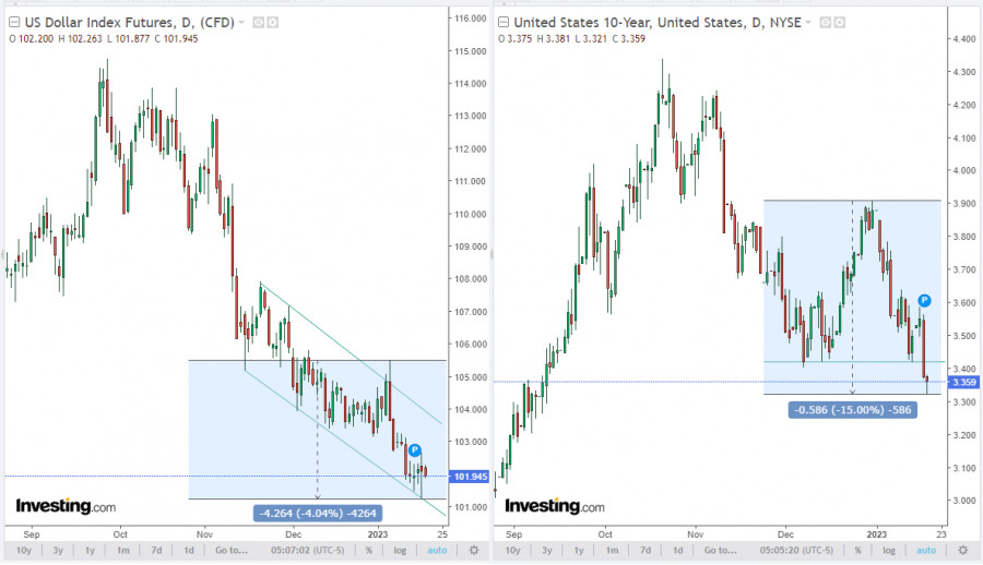 EUR/USD: краткие итоги и ближайшие перспективыИнстаФорекс - Instaforex, 2 года назад Сегодня доходность американских гособлигаций снижается, продолжая вчерашнее падение, что говорит о росте спроса на защитные активы, что также подтверждается ослаблением доллара против других популярных защитных активов, таких как иена, золото, франк. При этом индекс доллара DXY также возобновил снижение после неуверенного роста в начале этой недели. Все-таки участники рынка игнорируют намерение ФРС продолжать ужесточение своей монетарной политики. Здесь во главе угла стоит не то, что процентная ставка ФРС будет повышаться, а то – какими темпами и в каких размерах. То, что руководители ФРС на заседании 31 января и 01 февраля планируют повысить процентную ставку, уже не устраивает покупателей доллара. Они ждут от ФРС продолжения агрессивного ужесточения политики, а этого уже, пожалуй, не будет. Наиболее вероятным станет повышение процентной ставки на ближайшем заседании на 0,25%, а далее не исключается вариант, что руководители ФРС возьмут паузу, а затем могут и вовсе вновь перейти к смягчению политики. К этому могут подтолкнуть поступившие недавно свежие данные по инфляции в США. Так, опубликованный вчера отчет Бюро трудовой статистики Министерства труда США указал на очередное замедление производственной инфляции: индекс цен производителей снизился в декабре (до –0,5% против прогноза -0,1% и предыдущего значения +0,2% и до 6,2% в годовом выражении против прогноза 6,8% и предыдущего значения 7,3%). На прошлой неделе были опубликованы данные по потребительской инфляции, которые также указали на ее очередное замедление: в декабре годовой индекс потребительских цен вновь снизился, до 6,5% с 7,1% месяцем ранее, а базовый CPI – до 5,7%, с 6% в ноябре. При этом данные по отдельным важнейшим секторам американской экономики свидетельствуют о ее замедлении, что является следствием, в том числе, жёсткой политики ФРС. В частности, согласно вчерашним данным, объёмы промышленного производства вновь снизились (в декабре до -0,7% с -0,6% в ноябре), причем сильнее прогноза о снижении на -0,1%, а процент использования производственных мощностей – до 78,8% с 79,4% месяцем ранее. Несмотря на довольно хорошее состояние рынка труда, вышеперечисленные и другие данные оказывают давление на руководителей ФРС в том, чтобы пересмотреть свой жесткий подход в отношении параметров монетарной политики в сторону ее смягчения. Повышать ставки при ухудшении макро экономических показателей – это недопустимая ошибка, говорят экономисты, тем более что жесткая монетарная политика ФРС уже принесла свои плоды – инфляция снижается, хотя еще и далека рот целевого уровня в 2%. Сегодня участники рынка получат новую порцию информации и пищу для размышлений о перспективах монетарной политики ФРС: в 13:30 (GMT) Бюро трудовой статистики США опубликует еженедельные данные с рынка труда США. Ожидается рост числа заявок на пособия по безработице. Хотя рынок труда остается сильным, а безработица находится на минимальных допандемийных уровнях, рост числа безработных – это негативный фактор для доллара. Что же касается его основного конкурента на валютном рынке евро, то сегодня он растет в паре с долларом и в основных кросс-парах. Относительно перспектив евро инвесторы сохраняют оптимизм на ожиданиях очередного повышения процент
