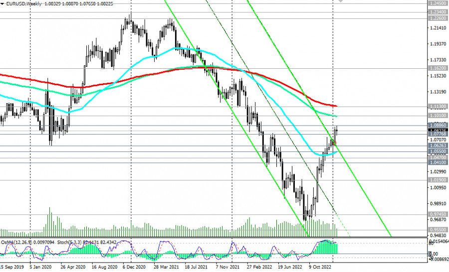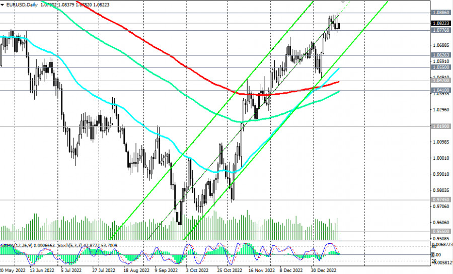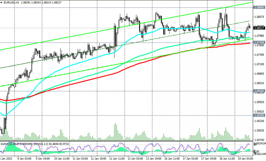 EUR/USD: сценарии динамики на 19.01.2023ИнстаФорекс - Instaforex, 2 года назад Как мы отметили в нашем сегодняшнем «Фундаментальном анализе», покупатели сохраняют оптимизм на ожиданиях очередного повышения процентной ставки ЕЦБ и на фоне вербальных интервенций его представителей. Выступая сегодня на Всемирном экономическом форуме в Давосе, глава ЕЦБ Кристин Лагард заявила, что «инфляционные ожидания не ослабевают», и «ЕЦБ будет продолжать повышать ставки». По ее мнению, «инфляция слишком высока», и «ЕЦБ намерен своевременно снизить ее до 2%». Завтра она вновь выступит с речью, которая начнется в 10:00 (GMT). Вероятно, до этого евро сохранит бычий импульс, полученный от сегодняшних заявлений Лагард. На момент же публикации данной статьи EUR/USD торговалась вблизи отметки 1.0822, оставаясь в зоне среднесрочного бычьего рынка, выше ключевых уровней поддержки 1.0470 (ЕМА200 на дневном графике), 1.0550 (ЕМА50 на недельном графике). Пробой вчерашнего локального и нового 9-месячного максимума 1.0886 станет сигналом для наращивания длинных позиций по EUR/USD, а пара направится в сторону ключевых уровней сопротивления 1.1010 (ЕМА144 на недельном графике), 1.1130 (ЕМА200 на недельном графике), отделяющих долгосрочный бычий тренд пары от медвежьего. В альтернативном сценарии и после пробоя вчерашнего и внутри недельного минимума 1.0766 и уровня поддержки 1.0777 (ЕМА200 на 1-часовом графике) EUR/USD направится к нижней границе восходящего канала на дневном графике и к отметке 1.0626, через которую также проходит 200-периодная скользящая средняя на 4-часовом графике. Дальнейшее снижение маловероятно; предпочтительными остаются длинные позиции. *) о важных событиях недели см. в Важнейшие экономические события недели 16.01.2023 – 22.01.2023 **) об особенностях торговли парой см. в EUR/USD: валютная пара (характеристики, рекомендации) Уровни поддержки: 1.0766, 1.0777, 1.0700, 1.0626, 1.0550, 1.0500, 1.0470, 1.0410 Уровни сопротивления: 1.0886, 1.0900, 1.1010, 1.1130