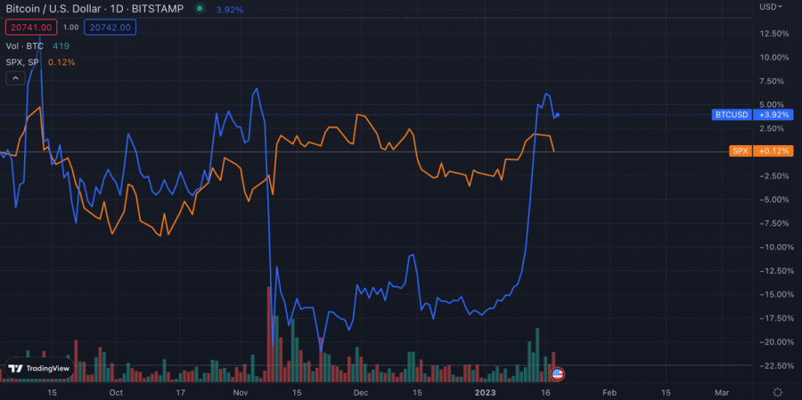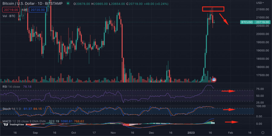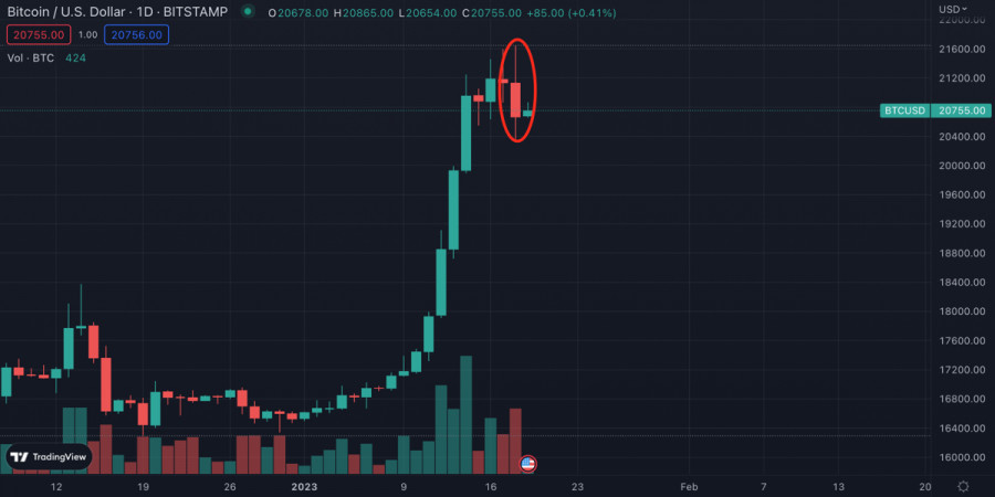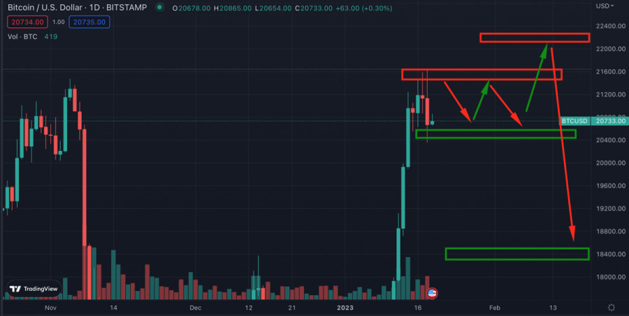 Биткоин обвалился ниже $21k на фоне негативных новостей: коррекция началасьИнстаФорекс - Instaforex, 2 года назад За последние две недели Биткоин в значительной мере нарастил бычьи мускулы. Покупательские объемы росли, а число уникальных активных пользователей обновляло локальные максимумы. Хешрейт актива также обновил ATH, что позволило Bitcoin удерживать высокий темп восходящего движения. Позитивная макростатистика, а именно уровень замедления инфляции и сильный рынок труда вселили уверенность в инвесторов. На этом фонде Биткоин, рынок криптовалют, а также фондовые индексы начали уверенное восходящее движение. В результате Биткоину удалось добраться и успешно закрепиться выше уровня $21k. Выше данной отметки покупатели столкнулись с ожесточенным сопротивлением медведей, но успешно удерживали позиции, параллельно поглощая объемы BTC, возникшие после фиксации прибыли. День негативных новостей18 января началось для рынка криптовалют и Биткоина с позитивных новостей. Показатели объемов розничных продаж в США, а также индекса цен производителей позволили BTC в моменте достигать уровня в $21,6k. Однако впоследствии череда негативных событий и активизации продавцов способствовали медвежьему пробою уровня $21k. Поставщиком негативных новостей стало издание Bloomberg, которое сообщило, что Genesis все же готовится подать заявление о банкротстве. Официальных заявлений об этом еще не поступало, но слухов хватило для роста уровня волатильности на крипторынке. Впоследствии стало известно, что Минюст США готовится сделать важное заявление о регулировании криптоотрасли. После публикации данной новости начались локальные продажи, которые достигли своего пика в моменте выступления чиновников США. Оказалось, что Соединенные Штаты обвинили российскую биржу в отмывании денег на сумму более $700 миллионов. На фоне этого Минюст заявил, что будет прикладывать куда больше усилий на пресечение отмывания денег через криптоактивы. Издание Bloomberg также отметило, что биржа Binance была названа в качестве основного контрагента подсанкционной криптоплатформы. Другая крипто биржа, FTX, в очередной раз подверглась хакерской атаке на сумму более $450 миллионов. Все эти события спровоцировали формирование негативного новостного фона вокруг криптовалют, а также существенно подпортили репутацию цифровых активов. Потенциально негативные известия могут прийти из фондового рынка. Фондовый рынокИндекс SPX по-прежнему не в состоянии пробить уровень сопротивления $3900. При этом эксперты ведущих банков придерживаются ранее опубликованных прогнозов о вероятном падении финансового инструмента в первом квартале 2023 года. Эксперты Goldman Sachs считают, что экономика справляется с текущими вызовами, совершая мягкую посадку. Вместе с тем аналитики уверены, что не стоит ожидать роста от SPX в 2023. В JPMorgan уверены, что падение индекса в первом квартале года неизбежно и необходимо сокращать лонговые позиции, так как локальная эйфория завершается. Аналитики Morgan Stanley также полагают, что S&P 500 может упасть до $3000 в случае публикации плохой отчетности. Общие выводы говорят о том, что в лучшем случае стоит надеяться на флетовое движение SPX, но при этом быть готовым к падению. Анализ BTC/USDНа фоне череды крайне негативных новостей на рынке криптовалют возрос уровень волатильности. В результате этого коти