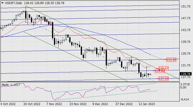 Прогноз по USD/JPY на 20 января 2022 годаИнстаФорекс - Instaforex, 2 года назад После повышенной валатильности йены в среду, рассматриваемая валюта вчера и сегодня утром движется в боковике. При этом сохраняется повышающееся настроение пары, ближайшая цель которого 129.80 – линия ценового канала старшего таймфрейма. В случае продолжения роста цену ждёт верхняя линия нисходящего ценового канала зелёного цвета в районе отметки 130.67. Выход из канала откроет цель 133.60. Осциллятор Марлин поддерживает рост цены ростом в собственном восходящем канале. Выход сигнальной линии осциллятора над нулевую линию усилит рост цены.