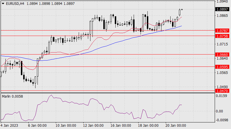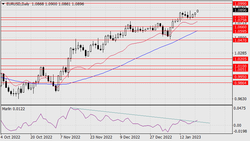 Прогноз по EUR/USD на 23 января 2022 годаИнстаФорекс - Instaforex, 2 года назад Бодрый пятничный рост фондовых рынков помог удержаться евро практически от «неминуемого» срыва с 9-ти месячной вершины. Открытие новой недели произошло даже с гэпом. И даже сигнальная линия осциллятора Марлин вышла над образующую дивергенцию линию.