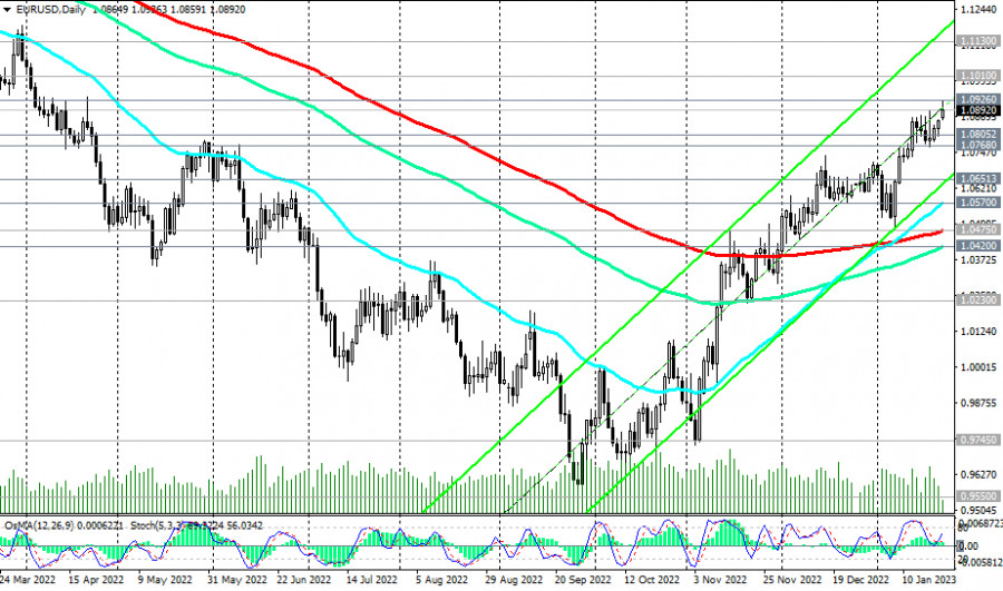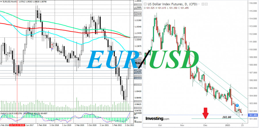 EUR/USD: краткие итоги и ближайшие перспективыИнстаФорекс - Instaforex, 2 года назад Закрыв минувшую неделю с небольшим снижением, оставаясь при этом с октября в нисходящем тренде, сегодняшний торговый день фьючерсы на индекс доллара DXY открыли с гэпом вниз в 26 пунктов. Судя по приложенному скрину с дневным графиком DXY, цена стремится к ближайшему уровню поддержки, проходящему через отметку 101.00 (нижняя линия нисходящего канала), и в случае дальнейшего снижения эта цель вскоре будет достигнута. Далее – психологически значимая отметка 100.00. Ну а пока что на фоне бедного на события сегодняшнего экономического календаря инвесторы проявляют осторожность; объемы торгов также остаются невысокими. При этом участники рынка также следят за событиями в США, где уже обсуждается вопрос о повышении лимита госдолга (в минувшую пятницу показатель превысил установленный ранее предел в 31,4 трлн долларов). Вероятно, нижняя палата Конгресса будет препятствовать принятию закона о повышении его лимита, но, скорее всего, и, как это уже не раз бывало ранее, лимит вновь будет повышен. Участники рынка успокоятся, доллар выиграет от этого решения, а его покупатели получат передышку. Но пока что доллар остается под давлением, прежде всего против своего основного конкурента на валютном рынке евро. В ходе сегодняшней азиатской торговой сессии пара EUR/USD продолжила рост, достигнув нового локального и 9-месячного максимума 1.0926. На момент публикации данной статьи пара снизилась к отметке 1.0892, но ее бычий тренд остается в силе, в то время как участники рынка рассчитывают на то, что Европейский центральный банк продолжит политику ужесточения своей денежно-кредитной политики. При этом у ЕЦБ остаётся гораздо большее пространство для маневра, чем у ФРС. При этом также следует обратить внимание на значительный дифференциал в уровнях процентных ставок в США и в еврозоне, 4,50% и 2,50% соответственно. На заседании в декабре базовая процентная ставка ЕЦБ по кредитам была повышена до 2,5%, а по депозитам — до 2%. По декабрьским оценкам экономистов, в 2023 году инфляция в еврозоне составит 6,3%, а в 2024-м — 3,4%. «Совет управляющих считает, что процентные ставки по-прежнему должны будут значительно повышаться... с целью обеспечения своевременного возврата уровня инфляции к среднесрочному целевому уровню в 2%», — сообщалось в заявлении по итогам заседания ЕЦБ. Выступая на прошлой неделе на Всемирном экономическом форуме в Давосе, глава ЕЦБ Кристин Лагард заявила, что «инфляционные ожидания не ослабевают» и «ЕЦБ будет продолжать повышать ставки». По ее мнению, «инфляция слишком высока» и «ЕЦБ намерен своевременно снизить ее до 2%». В ЕЦБ считают, что рост ВПП может сократиться, в том числе и из-за энергетического кризиса в ЕС, высокой неопределенности, ослабления мировой экономической активности и ужесточения условий финансирования. Однако рецессия не должна сильно затянуться, хотя и сильного роста ожидать также не приходится. Сегодня в 17:45 (GMT) Лагард вновь выступит с речью, и если она коснется вопросов монетарной политики, то наверняка тон ее заявлений сохранит ястребиный уклон, что может дополнительно поддержать евро и пару EUR/USD. А во вторник по Германии, Франции и еврозоне в целом выйдет целый блок важной макро статистики, в том числе индексы PMI в производственном секторе и секторе услуг за я