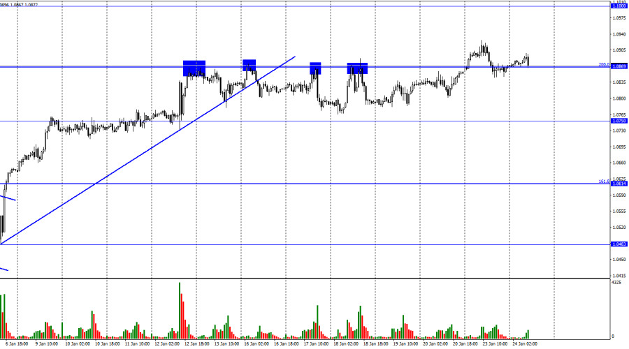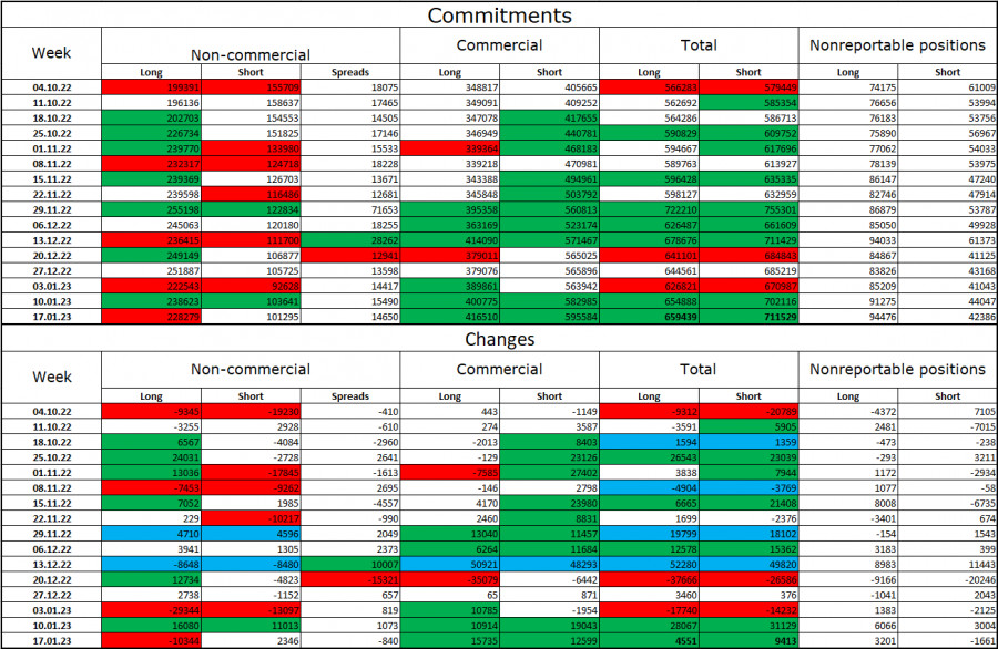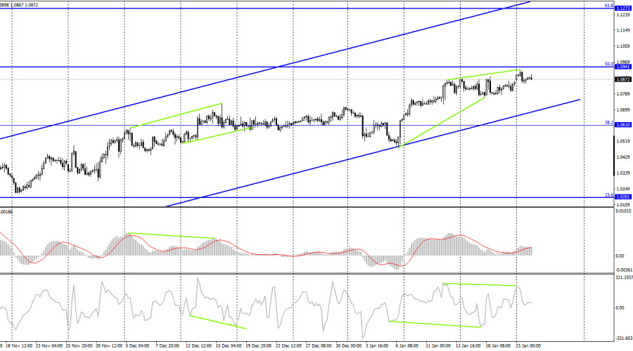 EUR/USD. 24 января. Экономический фон уходит на второй планИнстаФорекс - Instaforex, 2 года назад Добрый день, уважаемые трейдеры! Пара EUR/USD в понедельник выполнила закрепление над уровнем коррекции 200,0%, 1,0869. Таким образом, процесс роста теперь может быть продолжен в направлении следующего уровня 1,1000. Лично меня рост европейской валюты уже не удивляет. Только за последние три рабочих дня президент ЕЦБ Кристин Лагард трижды заявила, что инфляция может вновь начать расти, что ставки нужно продолжать повышать. Конечно, такая информация заставляет трейдеров-быков думать не о том, чтобы зафиксировать прибыль, а о том, чтобы продолжать покупать евровалюту. На мой взгляд, подобная риторика Кристин Лагард абсолютно логична, но мне кажется, что трейдеры уделяют ей слишком много внимания. Другими словами, все, что сказала Лагард за последнюю неделю, не является новостью. Любому экономисту ясно, что инфляция начала снижаться не только потому, что ЕЦБ повышает ставки уже полгода. И поэтому, конечно, тоже, но основным фактором является снижение цен на нефть и газ в те же самые полгода. Таким образом, опасения Лагард понятны и ясны. Желание ЕЦБ продолжать ужесточать денежно-кредитную политику – тоже. Инфляция действительно может перестать быстро снижаться, как она это делала в последние 2 месяца. И в этом случае ЕЦБ нужно будет продолжать повышать ставку дольше и сильнее, чем кто-то думает сейчас. Но в то же время для ФРС это тоже проблема, потому что рост цен на энергоносители будет разгонять заново инфляцию и в США тоже. Выходит, что оба центральных банка могут столкнуться с необходимостью более длительный срок повышать процентную ставку, но в случае с ФРС размер повышения может быть ниже, так как ставка уже доросла до 4,5%, а в Евросоюзе она приравнивается всего к 2,5%. Я думаю, что эта причина может еще несколько месяцев толкать трейдеров-быков к активным действиям на валютном рынке. На 4-часовом графике пара выполнила новый разворот в пользу валюты ЕС и продолжает процесс роста в направлении коррекционного уровня 50,0% - 1,0941. Отбой котировок от этого уровня сработает в пользу валюты США и некоторого падения в направлении уровня Фибо 38,2% - 1,0610. Восходящий трендовый коридор вновь характеризует настроение трейдеров, как «бычье». Сильного падения евровалюты до закрытия под коридором я не жду. «Медвежья» дивергенция у индикатора CCI может сработать в пользу некоторого падения пары в ближайшие дни. Отчет Commitments of Traders (COT):