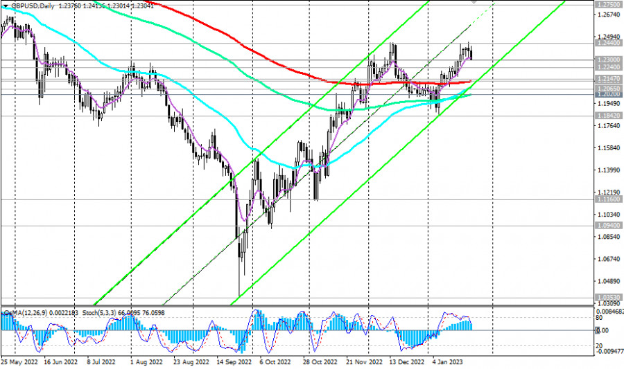 GBP/USD: сценарии динамики на 24.01.2023ИнстаФорекс - Instaforex, 2 года назад Как мы отметили в нашем сегодняшнем «Фундаментальном анализе», на фоне слабости американского доллара пара GBP/USD смогла скорректироваться в зону среднесрочного бычьего рынка, поднявшись выше отметок 1.2130, 1.2240, через которые проходят важные уровни поддержки: ЕМА200 на дневном графике и ЕМА200 на недельном графике. Несмотря на коррекционный (с конца сентября, когда в торги на рынке гособлигаций неожиданно вмешался Банк Англии) рост, ниже ключевых уровней сопротивления 1.2750 (ЕМА144 на недельном графике), 1.2900 (ЕМА200 на недельном графике) сохраняется долгосрочный и глобальный нисходящий тренд пары, делающий предпочтительными все же короткие позиции. Последовательный пробой уровней поддержки 1.2130, 1.2065 (ЕМА144 и нижняя граница восходящего канала на дневном графике), 1.2020 (ЕМА50 на дневном графике) вернет GBP/USD в зону долгосрочного медвежьего рынка, направив ее в сторону сентябрьских минимумов вблизи отметки 1.0400. Первым сигналом для наращивания коротких позиций может стать пробой важного краткосрочного уровня поддержки 1.2300 (ЕМА200 на 1-часовом графике). В альтернативном сценарии GBP/USD продолжит рост в сторону ключевых уровней сопротивления 1.2750, 1.2900. Сигналом для возобновления длинных позиций станет пробой сегодняшнего максимума 1.2413 и локального уровня сопротивления (и максимума этого месяца) 1.2440. *) об особенностях торговли GBP/USD также см. в статье GBP/USD: валютная пара (характеристики, рекомендации) **) о важных событиях недели см. в Важнейшие экономические события недели 23.01.2023 – 29.01.2023 Уровни поддержки: 1.2300, 1.2240, 1.2147, 1.2130, 1.2065, 1.2020, 1.2100, 1.2000, 1.1160, 1.0940 Уровни сопротивления: 1.2410, 1.2440, 1.2500, 1.2750, 1.2800, 1.2900