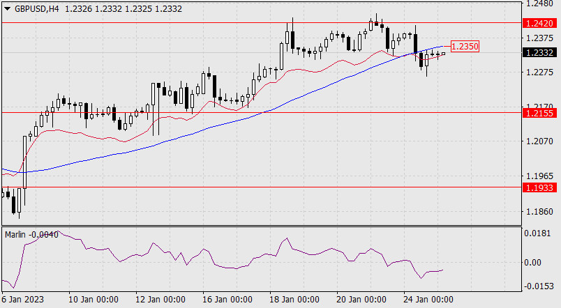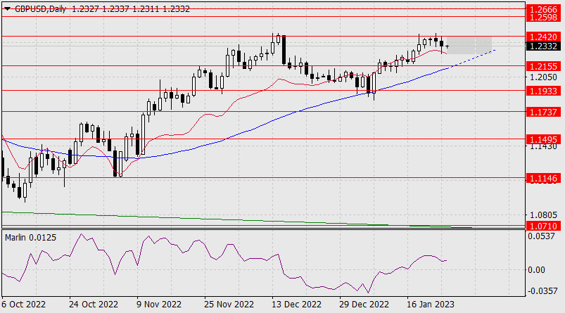 Прогноз по GBP/USD на 25 января 2022 годаИнстаФорекс - Instaforex, 2 года назад Британский фунт вчера не смог преодолеть сопротивление целевого уровня 1.2420, закрыл день снижением на 47 пунктов на фоне снижающегося осциллятора Марлин дневного масштаба. Данный откат пока является передышкой рынка перед возможным броском цены выше 1.2420, так как цена всё ещё выше индикаторной линии баланса (красного цвета), показывающей на преимущественный интерес участников рынка к покупкам.