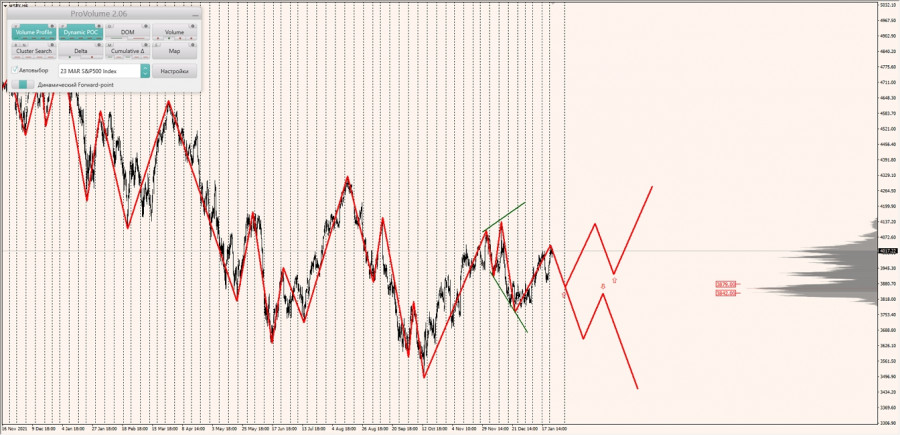 Альтернативный сценарий: при закреплении котировок индекса SNP500 ниже зоны 1/2 (3924.97) при откатах искать продажи по паттерну в новом диапазоне выгодных цен, с целями обновление минимумов и тестирование верхней границы НКЗ (3829.57).