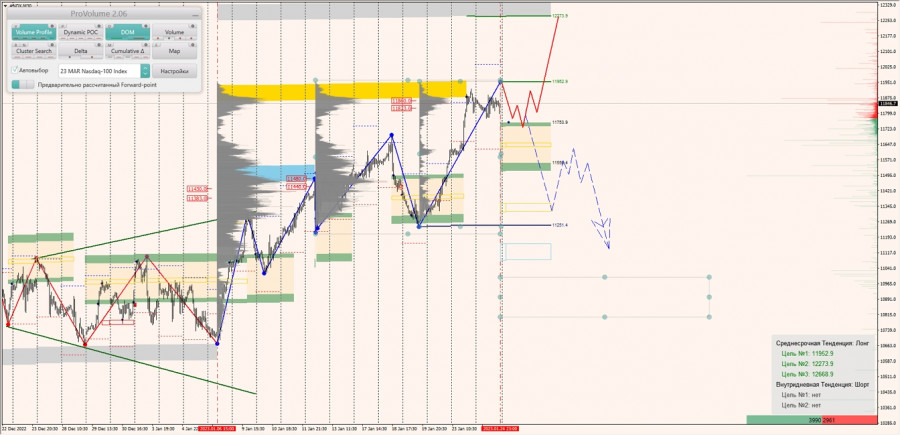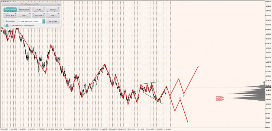 Среднесрочная тенденция: в лонг. Максимальное скопление объемов среднесрочной тенденции расположено в диапазоне по котировкам 11383.0-11430.0, 11440.0-11480.0 и 11823.0-11860.0. В настоящий момент по Nasdaq совершаются инвестиционные операции выше, указывая на силу покупателей.