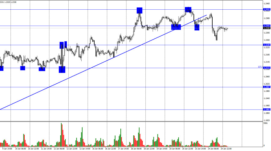 GBP/USD. 25 января. Трейдеры-медведи начали перехватывать рынок у быковИнстаФорекс - Instaforex, 2 года назад Добрый день, уважаемые трейдеры! На часовом графике пара GBP/USD выполнила новый разворот в пользу американской валюты и закрепление под уровнем 1,2342. К концу дня котировки выполнили возврат к этому уровню, отбой от него вновь сработает в пользу валюты США и возобновления падения в направлении уровня 1,2238. Закрытие курса пары над уровнем 1,2342 повысит вероятность возобновления роста в направлении уровня 1,2432. Закрепление под трендовой линией я считаю важным моментом, который может изменить настроение трейдеров на «медвежье».