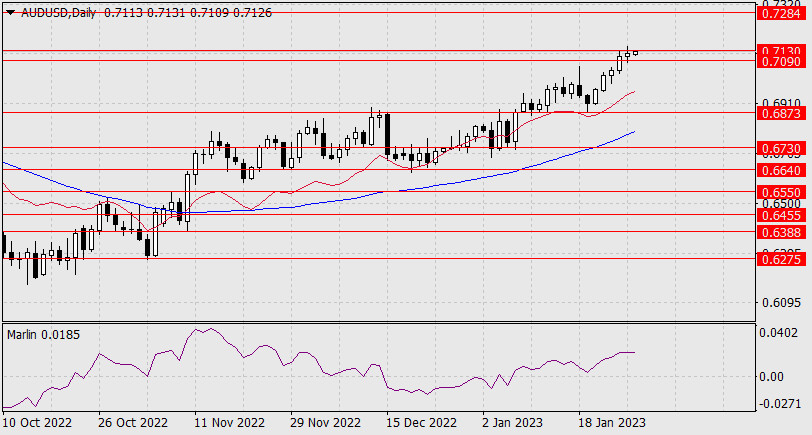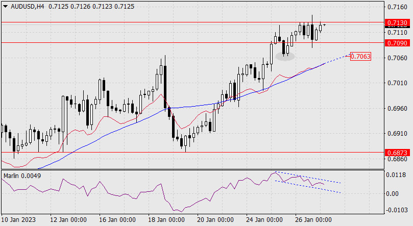 Прогноз по AUD/USD на 27 января 2022 годаИнстаФорекс - Instaforex, 2 года назад Котировка валютной пары AUD/USD провела первоначальное закрепление в диапазоне 0.7090-0.7130 – тело дневной свечи четверга полностью укладывается в данный диапазон. Сигнальная линия осциллятора Марлин начинает разворот вниз. Вполне возможно, что лидер текущей недели австралийский доллар устал расти и развернётся в снижение с текущих уровней. Возможно, цена выйдет над достигнутый диапазон, но в среду заседание ФРС, и в случае агрессивной тональности этого заседания американский доллар поведёт наступление по всем финансовым фронтам, а пара AUD/USD целевой уровень не достигнет. По факту мы получим типичный ложный выход цены над техническое сопротивление.