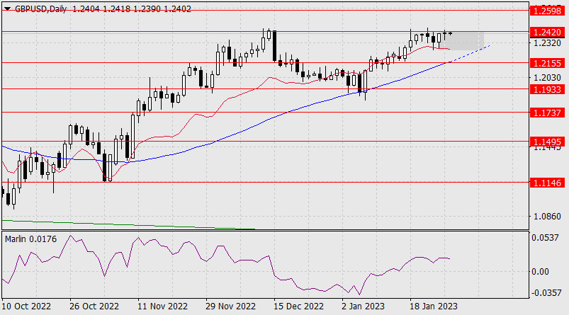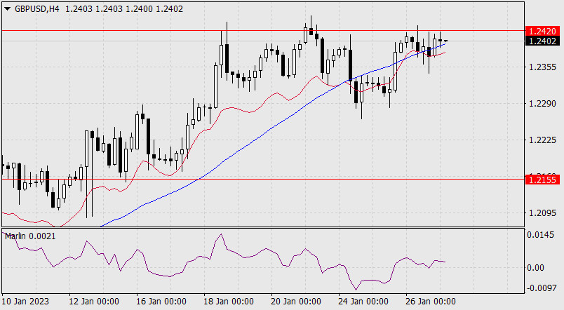 Прогноз по GBP/USD на 27 января 2022 годаИнстаФорекс - Instaforex, 2 года назад Фунт стерлингов закрыл вчерашний день почти на уровне открытия, всё сильнее подпирая уровень сопротивления 1.2420. Сигнальная линия осциллятора Марлин залегла в боковик, но её расположение всё же в положительной области, что в совокупности создаёт повышенную вероятность преодоления данного сопротивления сегодня или в понедельник. В этом случае откроется целевой уровень 1.2589 (значительное сопротивление мая-июня прошлого года). Осциллятор Марлин развивается в положительной области не смотря на вчерашнее кратковременное падение цены. Линия Крузенштерна, пусть и слабую в текущей ситуации, поддержку, всё же оказывает. Преодоление уровня 1.2420, скорее всего, произойдёт сегодня. |