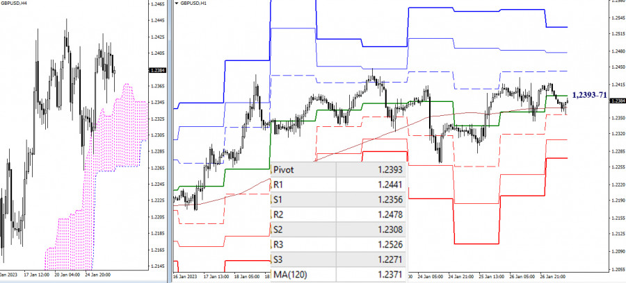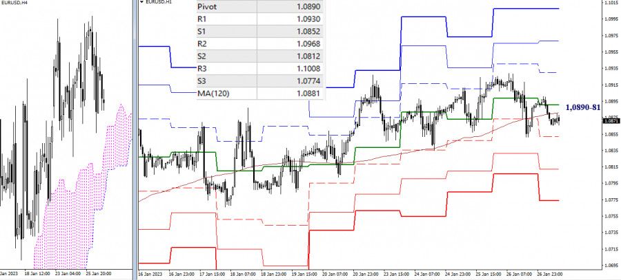 EUR/USD и GBP/USD 27 января – технический анализ ситуацииИнстаФорекс - Instaforex, 2 года назад EUR/USD Старшие таймфреймы Пара продолжает тестирование важных и сильных сопротивлений 1,0931-43 (верхняя граница недельного облака + месячный среднесрочный тренд). Но до сих пор нет результата, позволяющего говорить о преимуществах какой-либо стороны. Наблюдаем дневную консолидацию и неопределённость. Ближайшей поддержкой служит дневной краткосрочный тренд 1,0848, далее поддержками являются уровни дневного золотого креста Ишимоку 1,0757 – 1,0705 – 1,0653. Н4 – Н1 На младших временных интервалах пара работает в зоне притяжения и влияния ключевых уровней, которые сегодня объединяют свои усилия в пределах 1,0890 – 1,0881 (центральный Пивот уровень дня + недельная долгосрочная тенденция). Работа ниже уровней отдаёт преимущество развитию медвежьих настроений. Ориентирами для снижения внутри дня выступают поддержки классических Пивот уровней (1,0852 – 1,0812 – 1,0774). Закрепление и работа выше уровней будет формировать предпосылки для усиления бычьих настроений и реализации подъёма. Повышательные ориентиры сегодня можно отметить на 1,0930 – 1,0968 – 1,1008 (сопротивления классических Пивот уровней). *** GBP/USD Старшие таймфреймы Ситуация за прошлые сутки не изменилась. Пара продолжает консолидироваться, оставаясь в границах 1,2302 (дневной краткосрочный тренд + месячный среднесрочный тренд) – 1,2457 (верхние границы облаков Ишимоку месячного и недельного таймфреймов). В результате недельная свеча имеет характер неопределённости, что вряд ли уже будет изменено, так как до закрытия рабочей недели осталось совсем немного времени. Все выводы и ожидания, озвученные ранее, сохраняют свою актуальность. Н4 – Н1 На младших таймфреймах пара находится в зоне притяжения ключевых уровней, которые сегодня расположены в диапазоне 1,2393 – 1,2371 (центральный Пивот-уровень + недельная долгосрочная тенденция). Мувинг находится сейчас в горизонтальном положении, что подтверждает неопределённость текущего момента. Среди ориентиров внутри дня на случай развития движения можно в сложившейся ситуации обозначить сопротивления 1,2441 – 1,2478 – 1,2526 и поддержки 1,2356 – 1,2308 – 1,2271 классических Пивот уровней. *** При техническом анализе ситуации используются: старшие таймфреймы – Ichimoku Kinko Hyo (9.26.52) + уровни Фибо Киджун; младшие таймфреймы – Н1 – Pivot Points (классические) + Moving Avarage 120 (недельная долгосрочная тенденция). Материал предоставлен компанией InstaForex - www.instaforex.com |