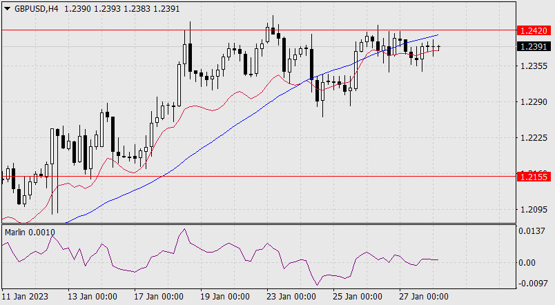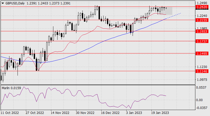 Прогноз по GBP/USD на 30 января 2022 годаИнстаФорекс - Instaforex, 2 года назад Фунт стерлингов продолжает консолидацию перед сопротивлением 1.2420. Сигнальная линия осциллятора Марлин дневного масштаба немного наклонена вниз, это может указывать на желание цены снизиться к нижней границе диапазона консолидации – к минимуму 24 января (1.2262).