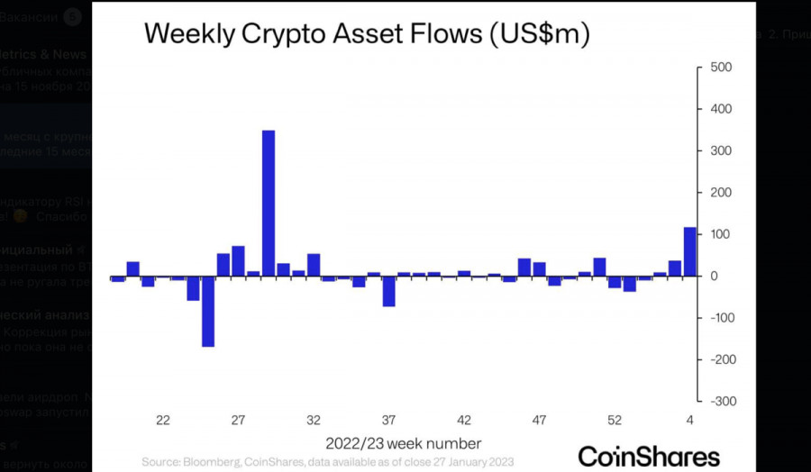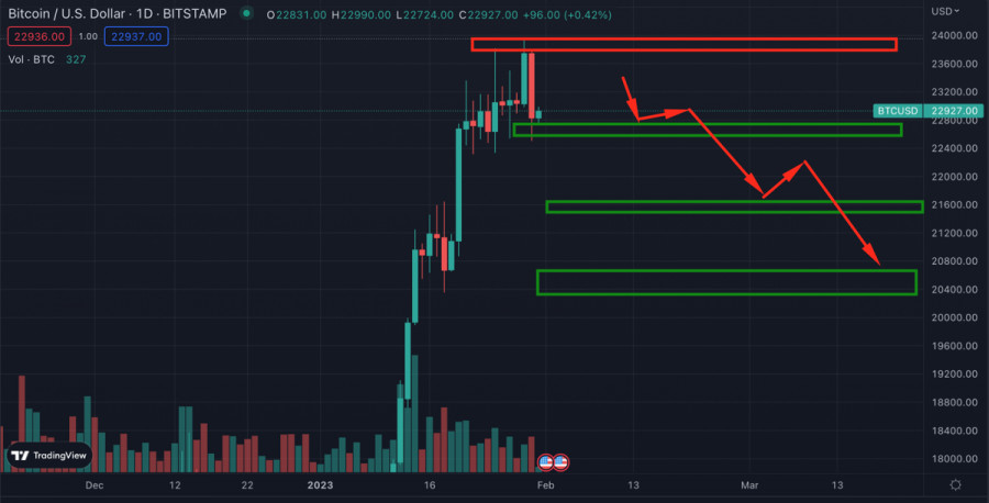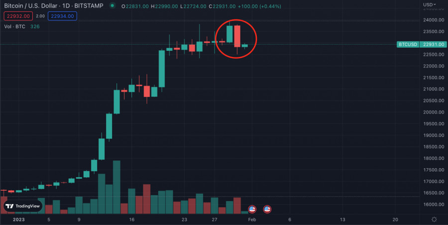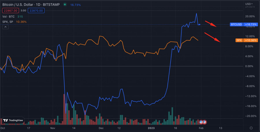 Биткоин снижается на фоне активизации продавцов: бычий тренд завершается?ИнстаФорекс - Instaforex, 2 года назад Биткоин находится в рамках восходящего тренда с начала января, и за этот период криптовалюте удалось достичь локального максимума на отметке $24k. Финальный рывок к психологическому уровню актив сделал после локальной консолидации вблизи $22,9k-$23,4k. Впоследствии покупателям удалось заколоть круглый уровень $24k, но с тех пор ситуация кардинальным образом не изменилась. Напротив, наблюдается локальное снижение торговой активности и слабость покупателей. Биткоину не удалось удержать уровень $23,5k, и актив рухнул ниже $23k. В результате мы видим, что BTC совершил ложный выход за пределы диапазона $22,9k-$23,4k. Мощное снижение цены по итогам вчерашнего дня подтверждают растущую силу продавцов. Однако стоит ли временную активизацию медведей воспринимать как начало коррекционного движения цены? Факторы движения цены BTCОдним из ключевых факторов снижения цены Bitcoin послужило аналогичное движение индекса S&P 500. Показатель снизился до ключевого уровня поддержки $4000 и, судя по техническим метрикам, продолжит снижаться. Учитывая высокий уровень корреляции, BTC может последовать за фондовым индексом. Еще одной причиной вероятного снижения котировок Биткоина могут быть данные, предоставленные CoinShares. Согласно данным аналитиков, компании и розничные торговцы вложили в BTC-продукты более $117 миллионов, что является крупнейшим результатом с начала 2022 года. Однако важно отметить, что более 99% этой суммы состоит из открытых длинных позиций. Движение индекса страха и жадности к отметке 60 подтверждает возникновение негативных сантиментов, которые могут привести к росту волатильности и импульсным движениям цены с целью выбить лонги/шорты. Заседание ФРС, которое состоится завтра, также может стать катализатором нисходящего движения криптовалюты. Согласно большинству прогнозов, ставка будет повышена на 0,25%, но куда важнее заявление чиновников ведомства. И здесь рынки может ждать неприятный сюрприз, так как инфляционный индекс PCE находится гораздо выше ожидаемого уровня. Это может повлечь за собой негативную риторику со стороны ФРС и приглушить инвестиционный запал. Также важно отметить, что в среднесрочной перспективе подавляющее большинство инвесторов ожидают обновление локальных минимумов котировками акций, согласно опросу BBG. Анализ BTC/USDПо итогам воскресенья Биткоин совершил бычий пробой области проторговки $22,9k-$23,4k. Первую половину понедельника актив провел в консолидационном движении, но с открытием американских рынков цена рухнула. По итогу BTC сформировал паттерн "медвежье поглощение", и от сегодняшней динамики движения цены можно понять, наступила ли коррекция актива. В моменте криптовалюта достигала отметки $22,5k, где произошла активизация покупателей, которые вытеснили продавцов выше $22,9k. Несмотря на то что откуп состоялся, его конечный результат вызывает вопросы в силе и уверенности быков. Технические метрики BTC начинают восстановительное движение с боковика, плавно переходящего в новый бычий импульс. Учитывая это, стоит ожидать попытку повторного штурма уровня $23k. Если активу удастся закрепиться выше данного уровня, то бычья идея до $24k вновь станет актуальной. Если Биткоин закроется ниже $23k, то перед медведями открывается дорога к