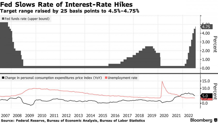 Компания по ужесточению денежно-кредитной политики в США подходит к своему концуИнстаФорекс - Instaforex, 2 года назад Евро улетел выше 1.1000 после того, как Джером Пауэлл, председатель Федеральной резервной системы заявил, что комитет провел ожидаемое повышение процентной ставки на четверть пункта, изменив свой тон заявлений на более голубиный по сравнению с декабрьским заседанием. По итогам двухдневного заседания Федеральная резервная система приняла решение замедлить рост процентных ставок, повысив их лишь на 25 базисных пунктов до диапазона 4,5%-4,75%. Рынки сильно не отреагировали на это, так как все ждали выступления Джэрома Паэулла, и только окончательно убедившись в том, что никакой агрессии со стороны центрального банка больше не ожидается, рисковые активы продолжили свой активный рост. То, что инвесторы ожидали услышать от Пауэлла: более оптимистичный взгляд на инфляцию и экономику, а также неспособность решительно подавить недавние рыночные ралли – все оправдалось. Очевидно, что председатель ФРС не был объективно голубиным, но и не слишком воинственно продвигал дальнейшее повышение ставок, чего было достаточно для рынка. Выступая перед журналистами в среду в Вашингтоне, Пауэлл сказал, что политики прогнозируют еще «пару» повышений ставок с нового целевого диапазона 4,5% до 4,75%, что уже выше, чем почти нулевой уровень в марте прошлого года. Он также отметил, что чиновники готовы скорректировать свои планы, если ценовое давление ослабнет быстрей, чем ожидалось, что убедило инвесторов в их правильных взглядах на происходящее. Когда его спросили о смягчении условий на финансовых рынках, что может затруднить путь центрального банка по возврату к целевому уровню инфляции в 2,0%, Пауэлл не выразил особой тревоги. Тем самым глава ФРС дал зеленый свет всему тому, что происходило на рынках с начала января этого года. Пауэлл также положил начало конца самой агрессивной кампании по ужесточению политики с 1980-х годов. Повышение на 25 базисных пунктов, которое комитет сделал вчера, было еще одним шагом к нормализации политики после повышения ставки на полпункта в декабре и четырьмя гигантскими повышениями на 75 базисных пунктов до этого. Мягкие данные по инфляции за последние месяцы были достаточно убедительными для ФРС, чтобы рассмотреть вопрос о приостановке своей кампании по повышению ставок. Несмотря на то, что комитет продолжает ссылаться на высокие цены, намек на еще два повышения на 25 базисных пунктов подтверждает ожидания рынка о конечной ставке на уровне 5,25%. В ходе пресс-конференции Пауэлл признал, что экономика США сейчас находится в эре дезинфляции с охлаждением ценового давления. Он подчеркнул, что необходимы дополнительные данные, прежде чем центральный банк США сможет объявить о своей победе, не уточнив, сколько еще данных за месяц потребуется чиновникам, чтобы убедиться, что инфляция находится на правильном пути. Что касается технической картины EURUSD, то спрос на евро вырос и может сохраниться. Для это необходимо удерживаться выше 1.1000, что подстегнет торговый инструмент к рывку в район 1.1050. Выше этого уровня можно легко забраться на 1.1090 с недалекой перспективой обновления 1.1125. В случае снижения торгового инструмента лишь провал поддержки 1.1000 увеличит давление на пару и столкнет EURUSD к 1.0960 с перспективой падения к мини