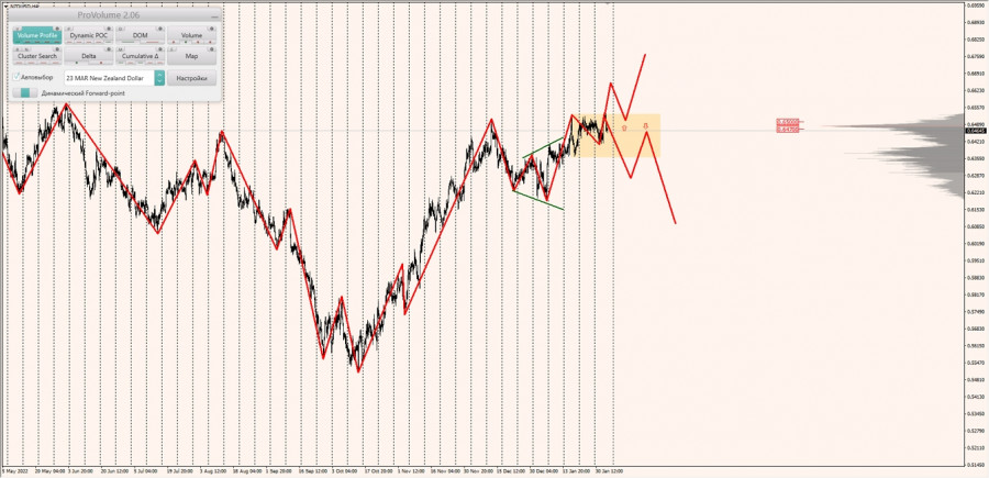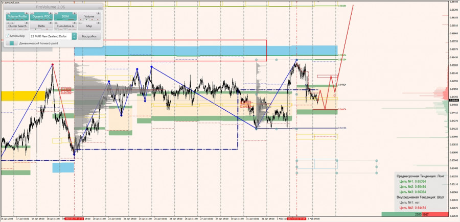 Среднесрочная тенденция: в лонг. Максимальное скопление объемов среднесрочной тенденции расположено в диапазоне по котировкам 0.64790-0.64850 и 0.64530-0.64600. В настоящий момент по паре совершаются инвестиционные операции внутри указанных диапазонов, указывая на временную неопределенность.