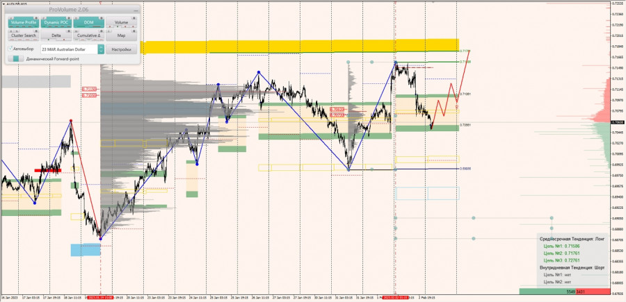 Среднесрочная тенденция: в лонг. Максимальное скопление объемов среднесрочной тенденции расположено в диапазоне по котировкам 0.71050-0.71150 и 0.70730-0.70820. В настоящий момент по паре совершаются инвестиционные операции ниже, указывая на слабость покупателей.