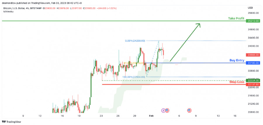 BTC/USD: ожидается бычий отскок до уровня свинг-хай. Прогноз на 3 февраля 2023ИнстаФорекс - Instaforex, 2 года назад На 4-часовом графике пара BTC/USD торгуется в бычьем тренде. В настоящее время цена находится выше облака Ишимоку, что указывает на бычий импульс. Рекомендуется покупать на откате на уровне 23180.00, где расположены поддержка и уровень коррекции Фибоначчи 61.8%. Стоп-лосс ордер может быть размещен на уровне 22137.60, расположенном чуть ниже промежуточной поддержки. Прибыль может быть зафиксирована на уровне 25212.00, соответствующем предыдущему уровню свинг-хай. Торговая рекомендация Вход: 23180.00 Условия для входа: повторное тестирование уровня поддержки и уровень коррекции Фибоначчи 61.8% Тейк-профит: 25212.00 Условия для фиксации прибыли: предыдущий уровень свинг-хай Стоп-лосс: 22137.60 Условия для активации ордера стоп-лосс: область, расположенная чуть ниже промежуточной поддержки Материал предоставлен компанией InstaForex - www.instaforex.com |