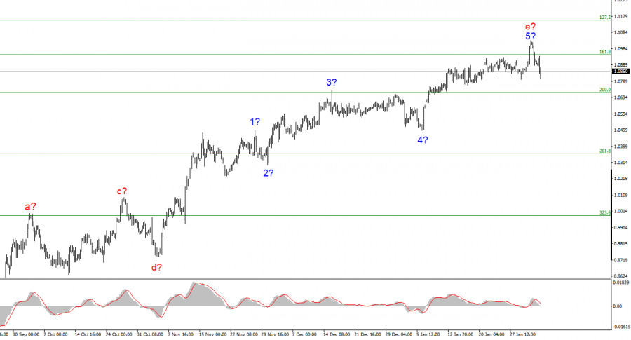 Анализ EUR/USD. 3 февраля. Долгожданное начало нисходящего участка тренда?ИнстаФорекс - Instaforex, 2 года назад Волновая разметка 4-часового графика для инструмента Евро/Доллар абсолютно не меняется в последнее время и остается сложной. Повышательный участок тренда принял ярко выраженный коррекционный(хотя его размер больше подходит для импульсного участка) и продолжает усложняться. Мы получили структуру волн a-b-c-d-e, в которой волна e имеет гораздо более сложный вид, чем первые четыре волны. Если текущая волновая разметка верна, то построение этой структуры может близится к своему завершению или уже заверщено, так как пик волны e намного превышает пик волны с. В этом случае нас ожидает построение минимум трех волн вниз, поэтому я по-прежнему готовлюсь к сильному снижению инструмента. В первые недели 2023 года спрос на евровалюту оставался стабильно высоким, а инструмент за этот период времени сумел один раз лишь немного отойти вниз от ранее достигнутых пиков. Однако в начале февраля американская валюта сумела выйти из-под давления рынка, и текущий отход котировок от достигнутых пиков может считаться началом нового понижательного участка тренда, которого я откровенно заждался. Хочется верить, что на этот раз волновая разметка не будет нарушена. Рынок учел все повышения ставки ЕЦБ.Инструмент Евро/Доллар в четверг снизился на 80 базовых пунктов. Не очень много для того новостного фона, который был в среду и в четверг. Напомню, что в среду вечером подвела результаты заседания ФРС. Ставка была повышена на очередные 25 базисных пунктов, а Джером Пауэлл отверг предположение о взятии паузы в ближайшее время. Таким образом, ставка ФРС будет расти в ближайшие месяцы темпами по 25 базисных пунктов, как и предполагал рынок месяц назад и ранее. Это в январе после отчета по инфляции рынок начал пониковать, ожидая, что ФРС в марте уже откажется от ужесточения денежно-кредитной политики. Этот миф был развеяен председателем Федеральной Резервной системы. Но в любом случае переход к более «мягкому» подходу ФРС был учтен заранее. Валюта США еще немного упала в среду вечером, но потом уже только укреплялась. Итоги заседания ЕЦБ можно назвать еще более скучными. Ставка выросла на 50 базисных пунктов, а Кристин Лагард отметила, что на следующем заседании она опять поднимется на 50 пунктов. Именно такой вариант и являлся рабочим для рынка, поэтому все эти изменения тоже были учтены рынком давным-давно. Спрос на евровалюту в четверг снизился именно поэтому. Я считаю, что дисбаланс между ставками ЕЦБ и ФРС уже тоже учтен, поэтому новостной фон теперь может входить в гармонию с волновым анализом. Если причин покупать евровалюту больше нет, то наконец-то может начаться построение понижательного участка тренда. Хотя бы коррекционного. Также стоит отметить, что риторика Кристин Лагард получилась не слишком убедительной, и многие аналитики заметили в ней скрытые намеки на отказ от ужесточения через 2 заседания. Ставка к тому моменту не приблизится к ставке ФРС. Евро может терять поддержку рынка в ближайшее время. Общие выводы.Исходя из проведенного анализа, я делаю вывод, что построение восходящего участка тренда близится к своему завершению или завершено. Таким образом, сейчас можно рассматривать продажи с целями, расположенными около расчетной отметки 1,0350, что соо