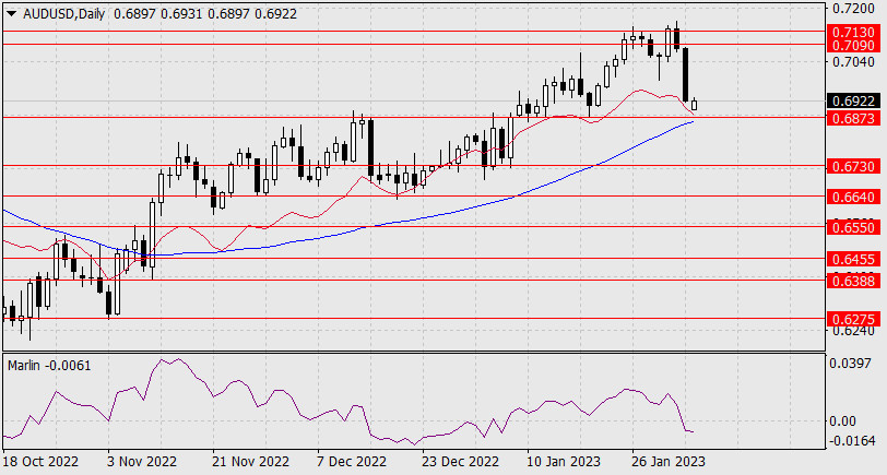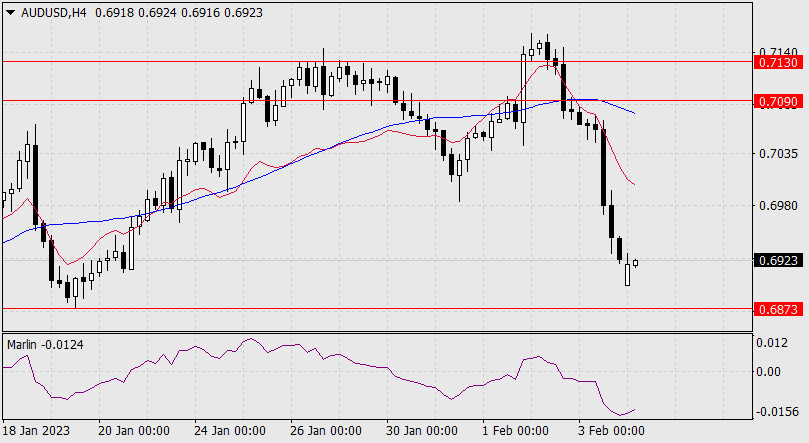 Прогноз по AUD/USD на 6 февраля 2023 годаИнстаФорекс - Instaforex, 2 года назад В пятницу австралийский доллар совершил первоначальный прорыв вниз с целью разворота в среднесрочное понижение. Таким действием стал переход осциллятора Марлин дневного масштаба на территорию понижающейся тенденции.