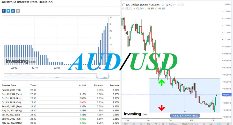 AUD/USD: накануне заседания РБАИнстаФорекс - Instaforex, 2 года назад Оттолкнувшись в минувший четверг от локального 10-месячного минимума 100.68, в пятницу индекс доллара DXY резко вырос. Укреплению доллара и росту его индекса способствовала опубликованная в пятницу американская трудовая статистика. Как сообщили в Минтруда США, количество рабочих мест в несельскохозяйственном секторе в январе выросло на 517 000 человек, а безработица снизилась до уровня 3,4% (с 3,5% в декабре). Опубликованные данные NFP также оказались значительно сильнее прогнозных значений (+185 000 человек, после декабрьского роста на +260 000). При этом годовой рост средней почасовой оплаты труда американцев составил +4.4%, косвенно свидетельствуя о продолжающемся давлении со стороны потребительской инфляции. Сразу после публикации данного отчета доллар резко укрепился, а его индекс DXY закрыл торговый день пятницы на отметке 102.75, на 2% выше локального 10-месячного минимума 100.68, достигнутого в четверг, накануне публикации NFP. Опубликованные данные придали уверенности покупателям доллара, и сегодня он вновь растёт, в то время как его индекс DXY уже преодолел отметку 103.00. Тем не менее этого рывка «на север» пока еще недостаточно, чтобы доллар смог переломить негативную динамику. В целом, преобладает все же нисходящая динамка доллара и индекса DXY. Все еще стоит угроза возобновления снижения DXY в сторону психологически важной отметки 100.00. Эта неделя особо не будет насыщена публикацией американской макро статистики. Вероятнее всего, доллар сохранит полученный в пятницу сильный бычий импульс. А вот сможет ли он его значительно развить, пока что такая перспектива находится под вопросом. В динамике же основных долларовых валютных пар на этой неделе, вероятно, стоит ориентироваться на динамику контрагентов американского доллара и на поступающую важную макро статистику из других стран с развитой экономикой. В частности, завтра в начале торгового дня будет опубликована статистика по внешней торговле Австралии, а в 03:30 (GMT) будет опубликовано решение РБА по процентной ставке. Широко ожидается, что процентная ставка вновь будет повышена, на 0,25%, до уровня 3,35%. На заседании в декабре РБ Австралии повысил свою процентную ставку на 0,25%, предпочитая, таким образом, двигаться более мелкими шагами, чем другие крупнейшие мировые центральные банки, в борьбе с высокой инфляцией. «С учетом продвижения к полной занятости и данных по ценам и зарплатам некоторое сворачивание чрезвычайной денежно-кредитной поддержки, оказываемой во время пандемии, целесообразно», и «правление (центрального банка) будет делать все необходимое для того, чтобы со временем инфляция в Австралии вернулась к целевому уровню». «Это потребует дальнейшего повышения процентных ставок в будущем", сказал управляющий РБА Филип Лоу еще летом прошлого года. И пока что РБА двигается именно по этому пути. И хотя в ответ на декабрьское решение РБА австралийский доллар отреагировал весьма сдержанно, все же пара AUD/USD, пользуясь также слабостью американского доллара, выросла с начала 2023 года, прибавив еще 3,6% и достигнув в начале февраля нового локального и 7-меясчного максимума 0.7157. Однако, падения в минувшие 2 торговых дня (после публикации сильной макро статистики из США) хватило, чтобы наполовину перечеркнуть завоевания AUD/USD предыдущего месяц
